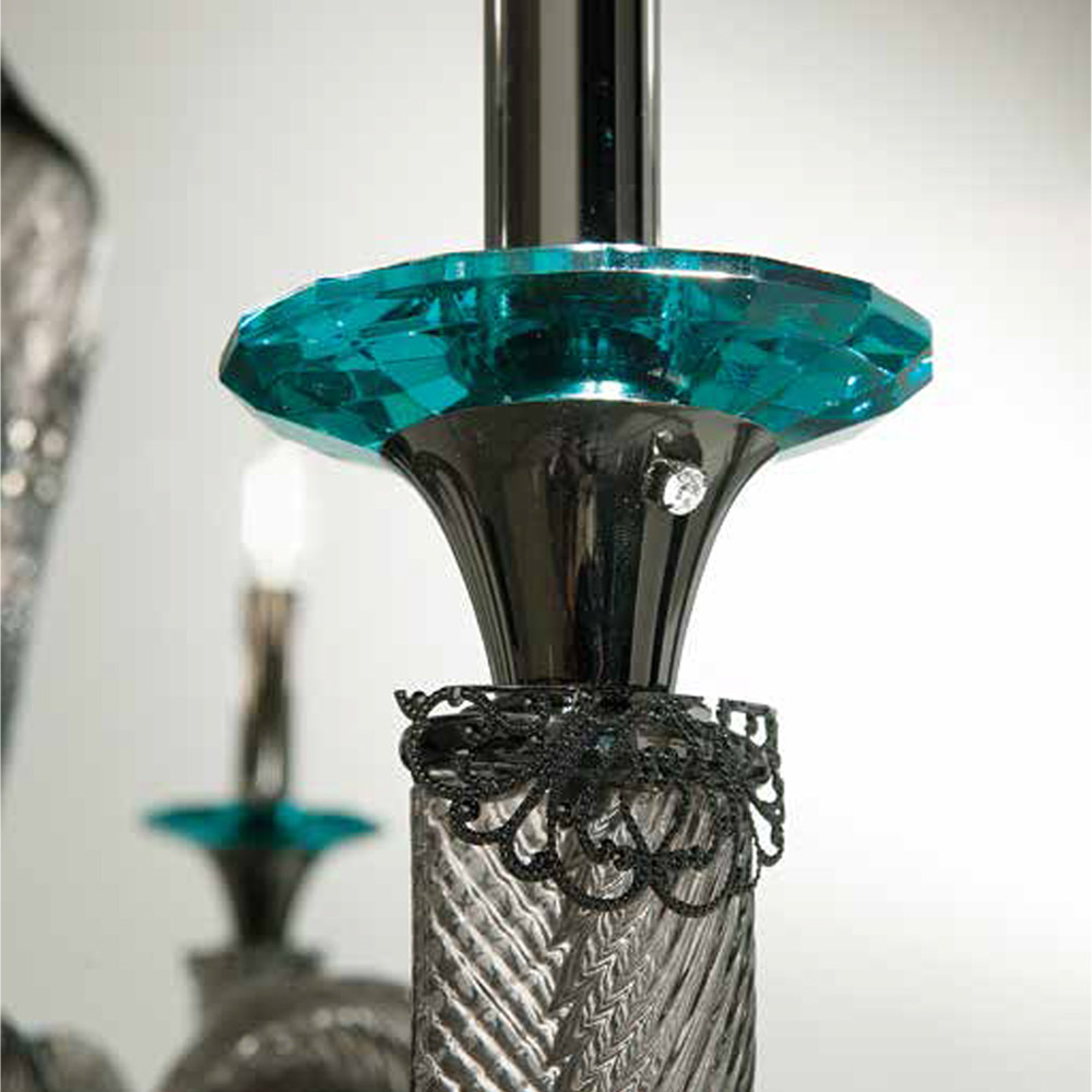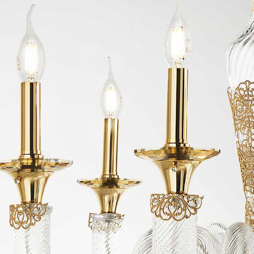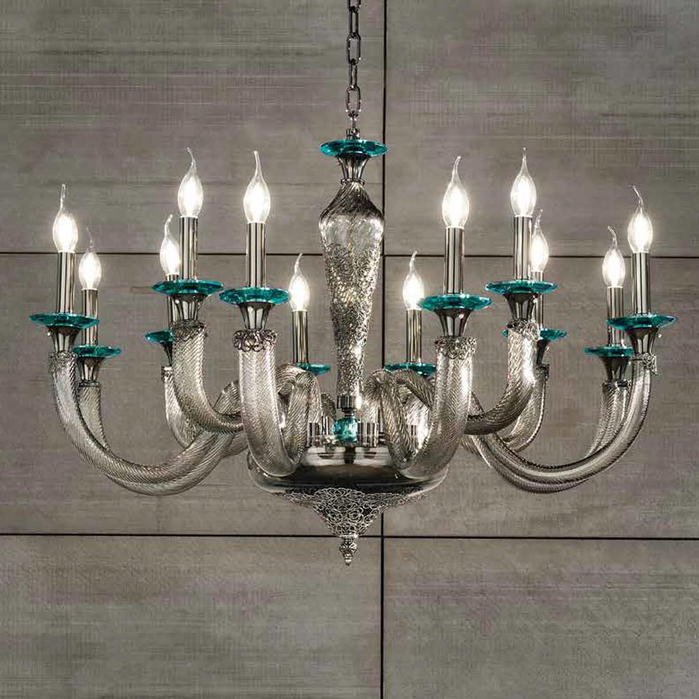 Der 12-flammige Kronleuchter ist ein luxuriöses Beleuchtungszubehör , das vollständig in Italien aus hochwertigem , handgefertigtem Glas hergestellt wird und sich durch den besonderen ovalen Abschnitt der Arme auszeichnet.
