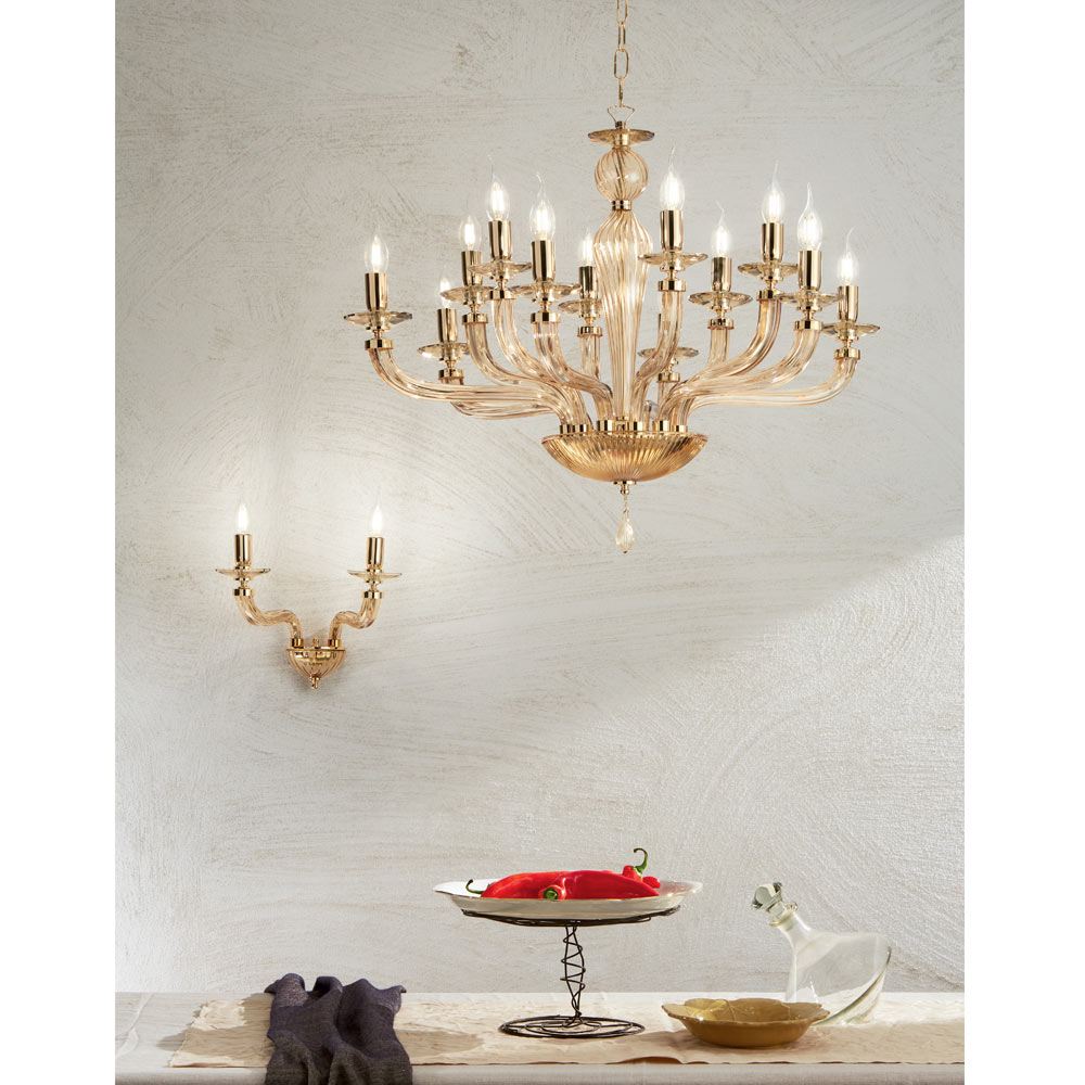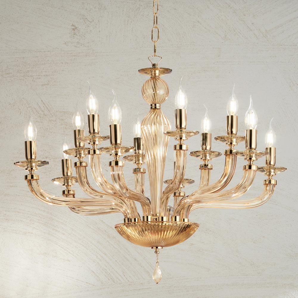 Dieser Hängeleuchter im klassischen Stil besteht aus 12 gebogenen Armen aus handgefertigtem Glas in Italien mit „Rigaton“-Effekt in Bernsteinoptik, die die Untertassen mit den Lichtquellen tragen.
