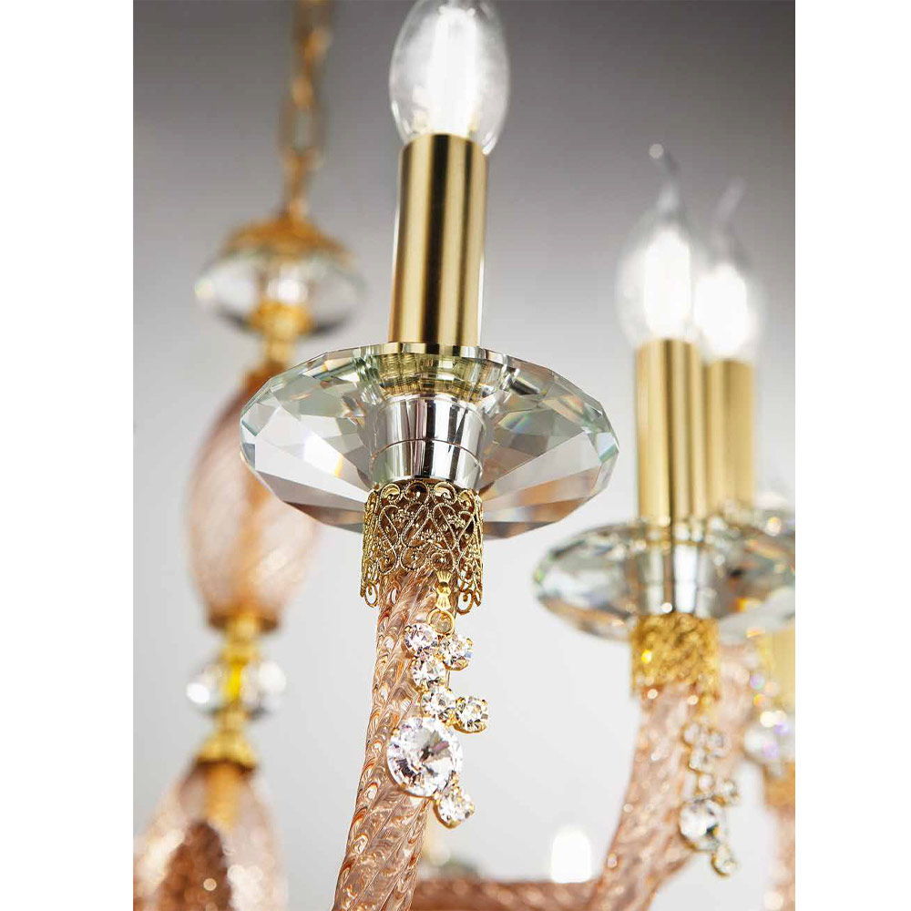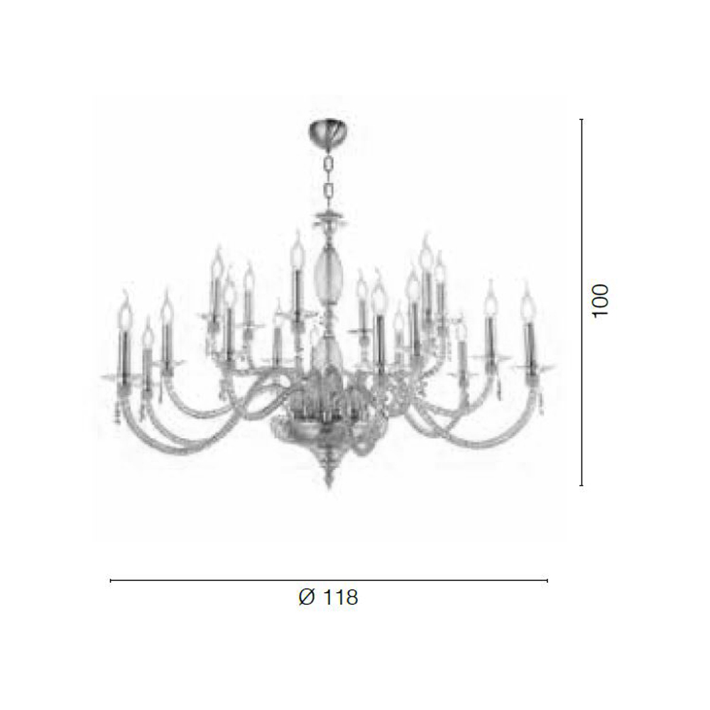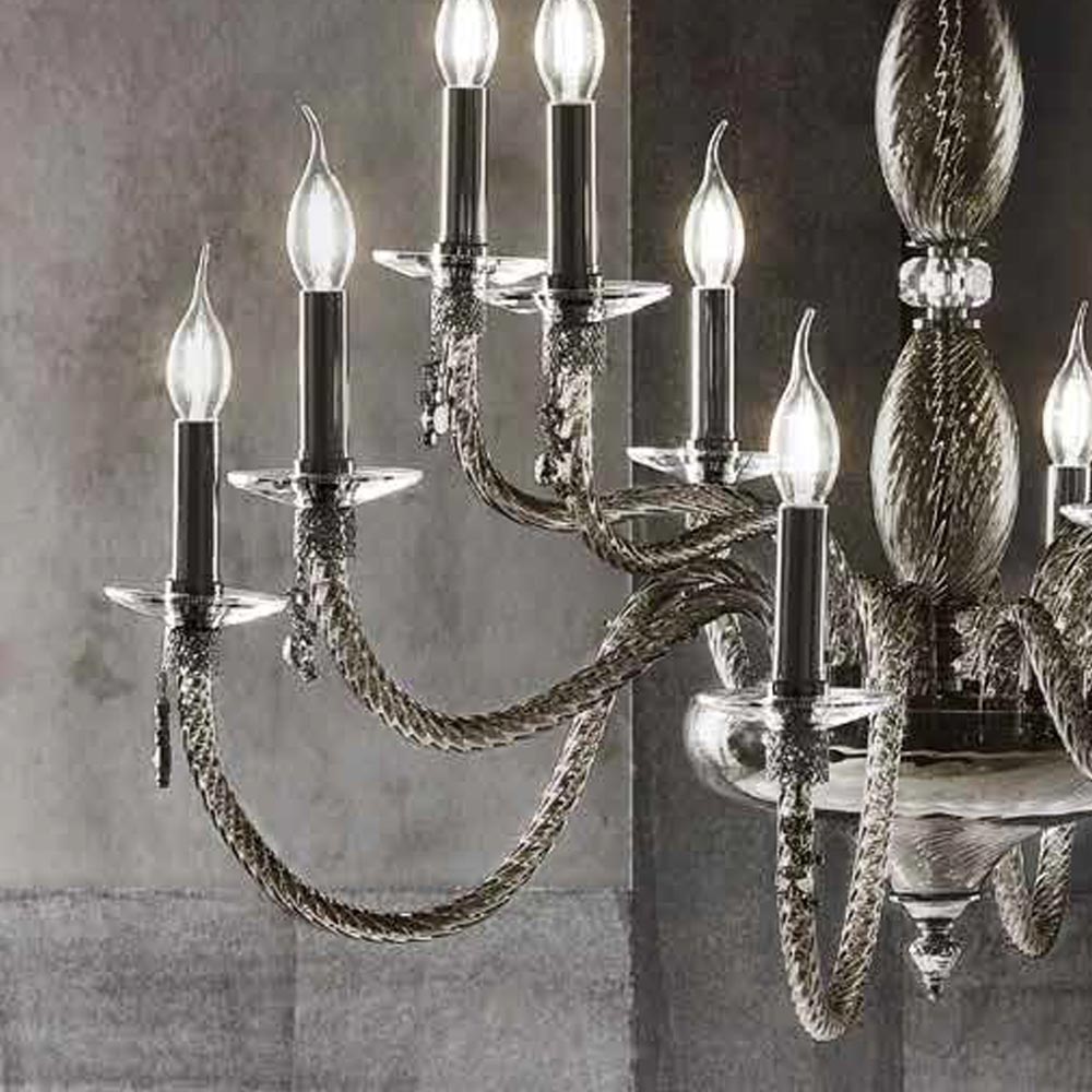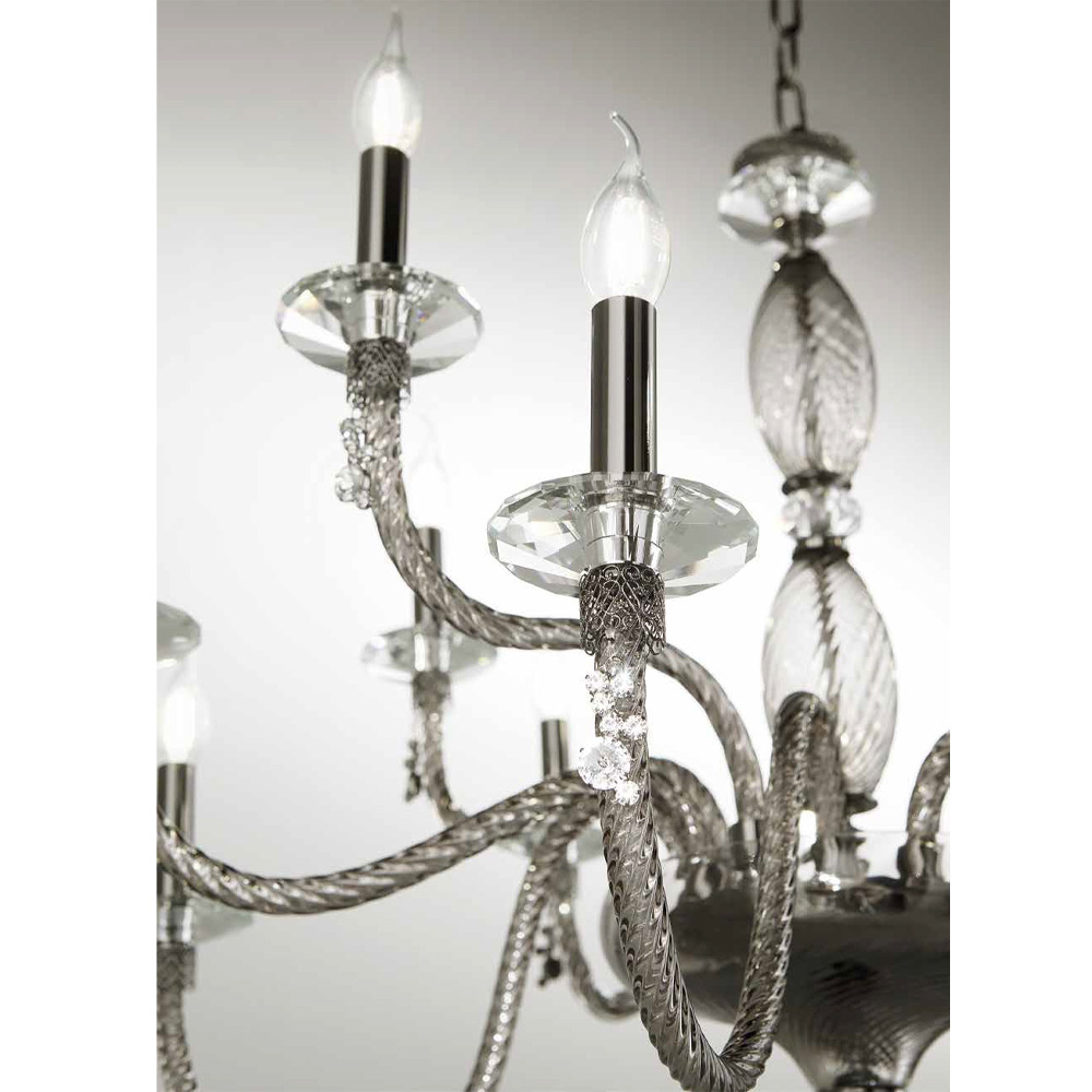 Der 18-flammige Kronleuchter ist ein luxuriöses Beleuchtungszubehör , das vollständig in Italien aus mundgeblasenem Glas von höchster Qualität mit Metallic- Finish hergestellt wird. Was es einzigartig und majestätisch macht, sind die ebenfalls handgefertigten Juwelendetails und die handgefertigten filigranen Metallelemente, die einen klassischen Stil vergangener Zeiten zum Leben erwecken, dessen Charme zum Protagonisten im Bestimmungsort wird.