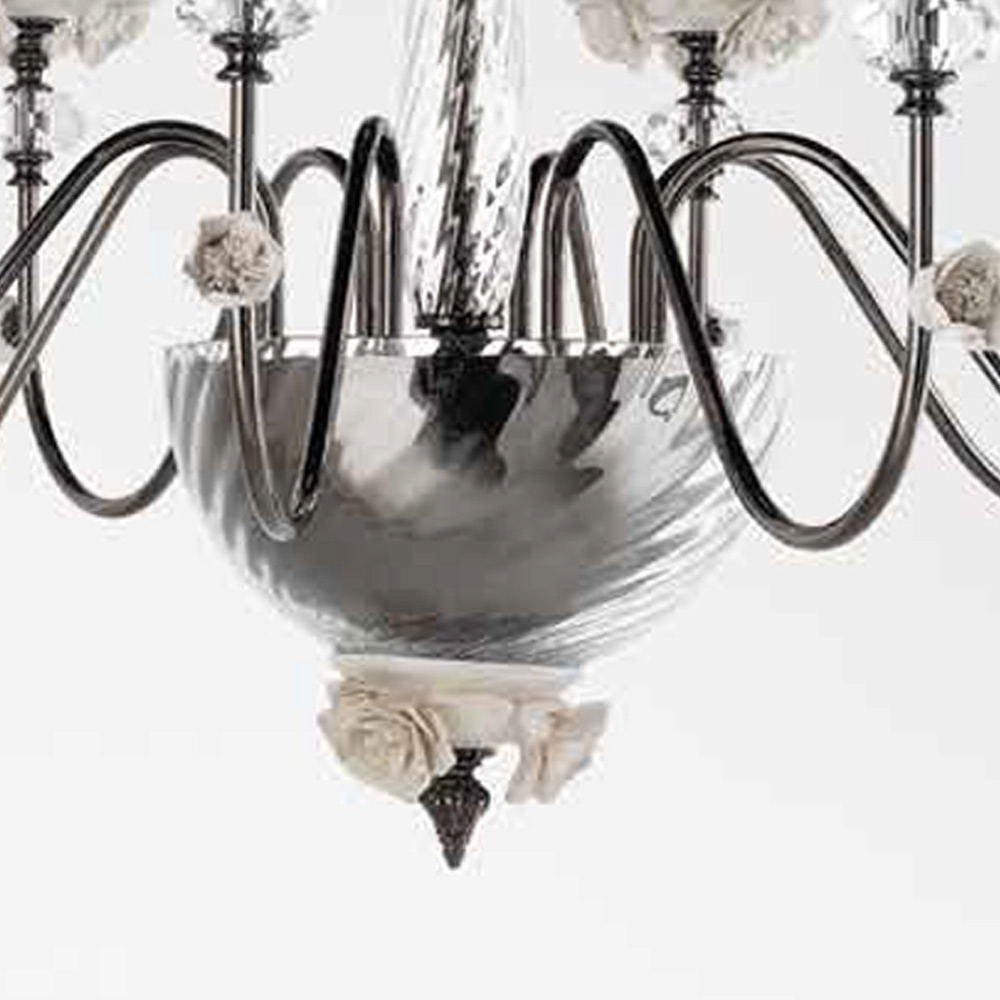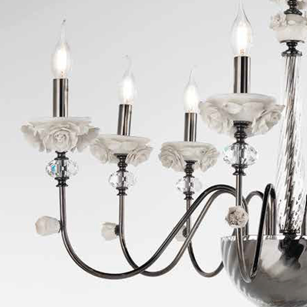 Der 8-flammige Kronleuchter ist ein luxuriöses Beleuchtungszubehör , das vollständig in Italien aus sehr feinem Porzellan und hochwertigem mundgeblasenem Glas handgefertigt wird und auf einer Metallstruktur mit silbernen Schweißnähten ruht.