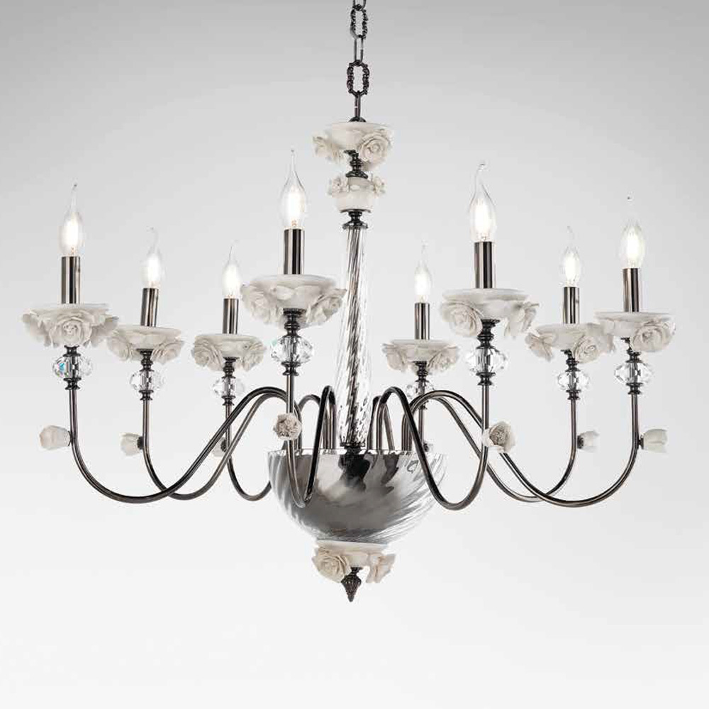 Kronleuchter mit 8 Lichtern aus Porzellan und mundgeblasenem Glas, Luxus made in Italy.