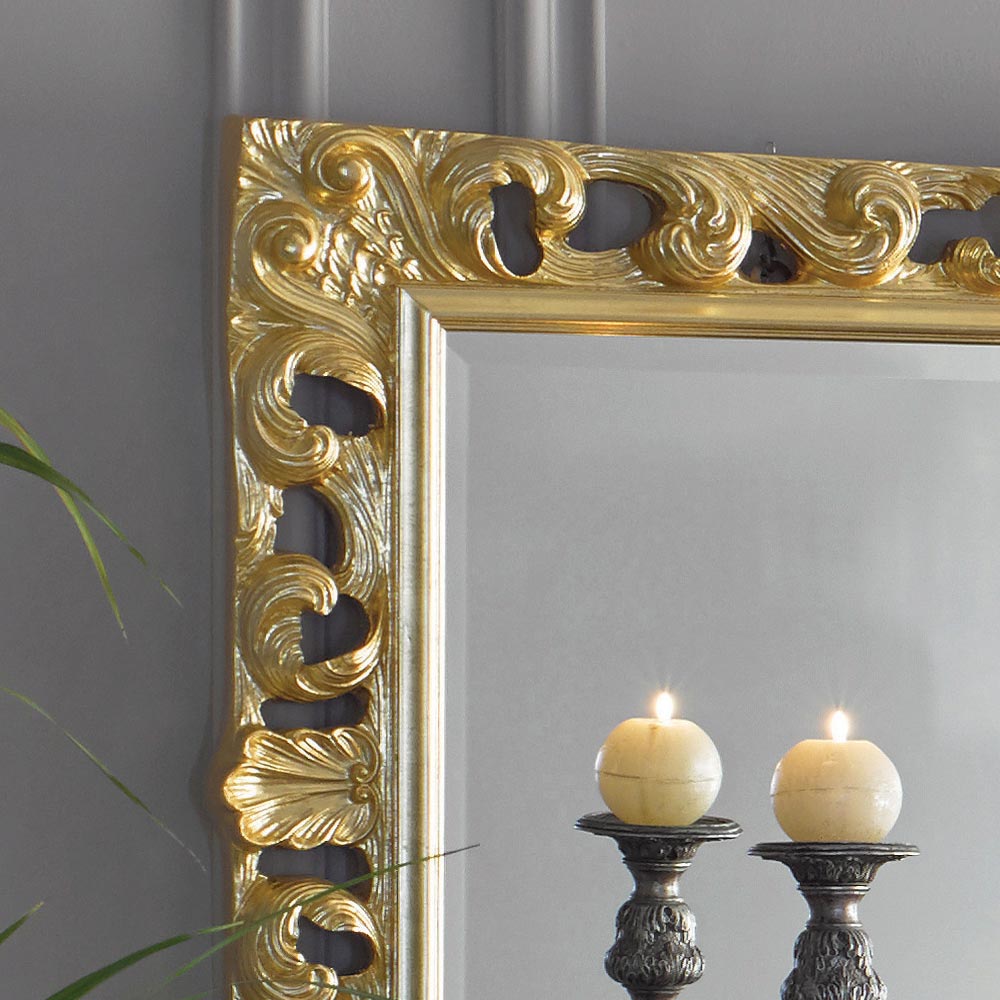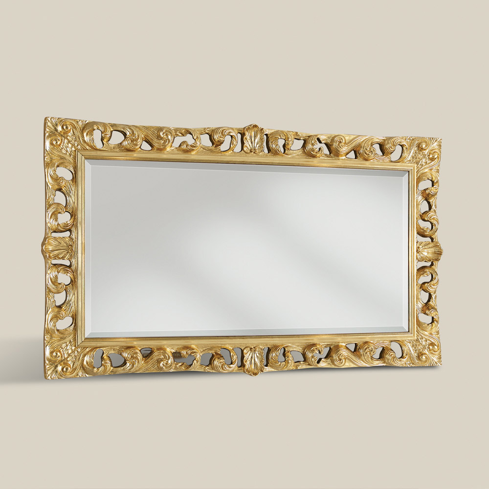 Klassischer rechteckiger Spiegel mit Holzrahmen, der mit Blattgold verziert ist . Mit seinen eleganten und harmonischen Formen ist es ideal, um jeder Umgebung einen klassischen und luxuriösen Touch zu verleihen. Eine einzigartige und raffinierte Ergänzung , die vollständig in Italien von erfahrenen Handwerksmeistern hergestellt wird, Meister der Kunst, die jede Ergänzung mit Weisheit und Geschmack für Eleganz vervollständigen. Die Produktion erfolgt unter Verwendung hochwertiger Materialienundmitder größten Sorgfalt und Professionalität , die die Produkte Made in Italy auszeichnen .