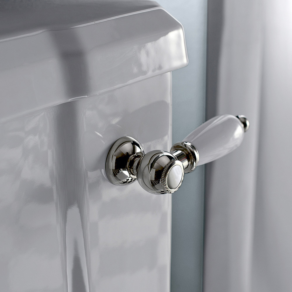 Marwa ist eine stattliche Monoblockvase mit tropfendem Rand und Bodenablauf . Moderne und Tradition merge mit der Verwendung des weißen Sitzes mit Chrom Scharnieren und dem Monoblock - Kasten mit Loch für die Drain - Batterie mit vorderen Hebeln in weißer Keramik und vernickelt.