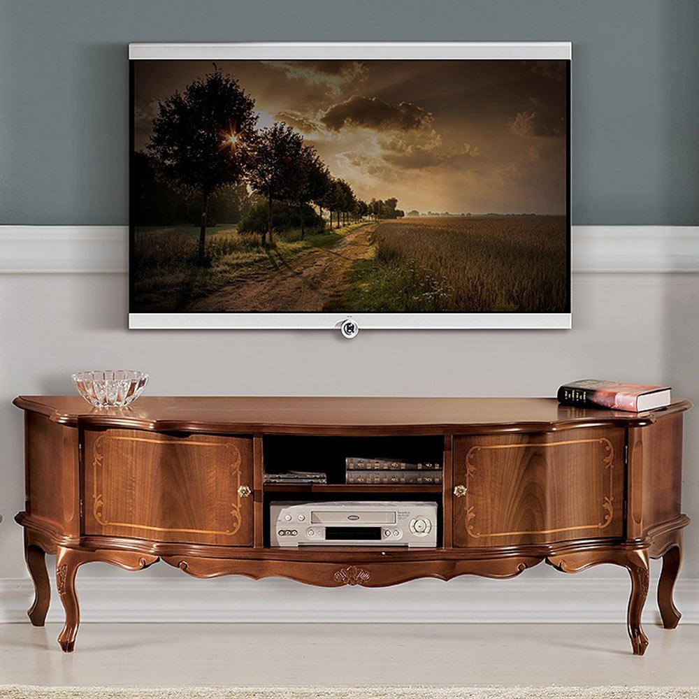 TV-Ständer im klassischen Stil mit 2 Türen und 2 Fächern aus Holz, entworfen, um den Wohnbereich mit Persönlichkeit und Geschmack einzurichten, auch dank der wunderbaren verfügbaren Oberflächen. Ein einzigartiges und raffiniertes Accessoire, vollständig in Italien von erfahrenen Handwerksmeistern hergestellt, Meistern der Kunst, die jedes Stück mit Geschick und Sinn für Eleganz fertigstellen. Die Produktion erfolgt aus hochwertigen Materialien und die Verarbeitung erfolgt vonHand mit größter Sorgfalt und Professionalität, die Made in Italy -Produkte auszeichnet.