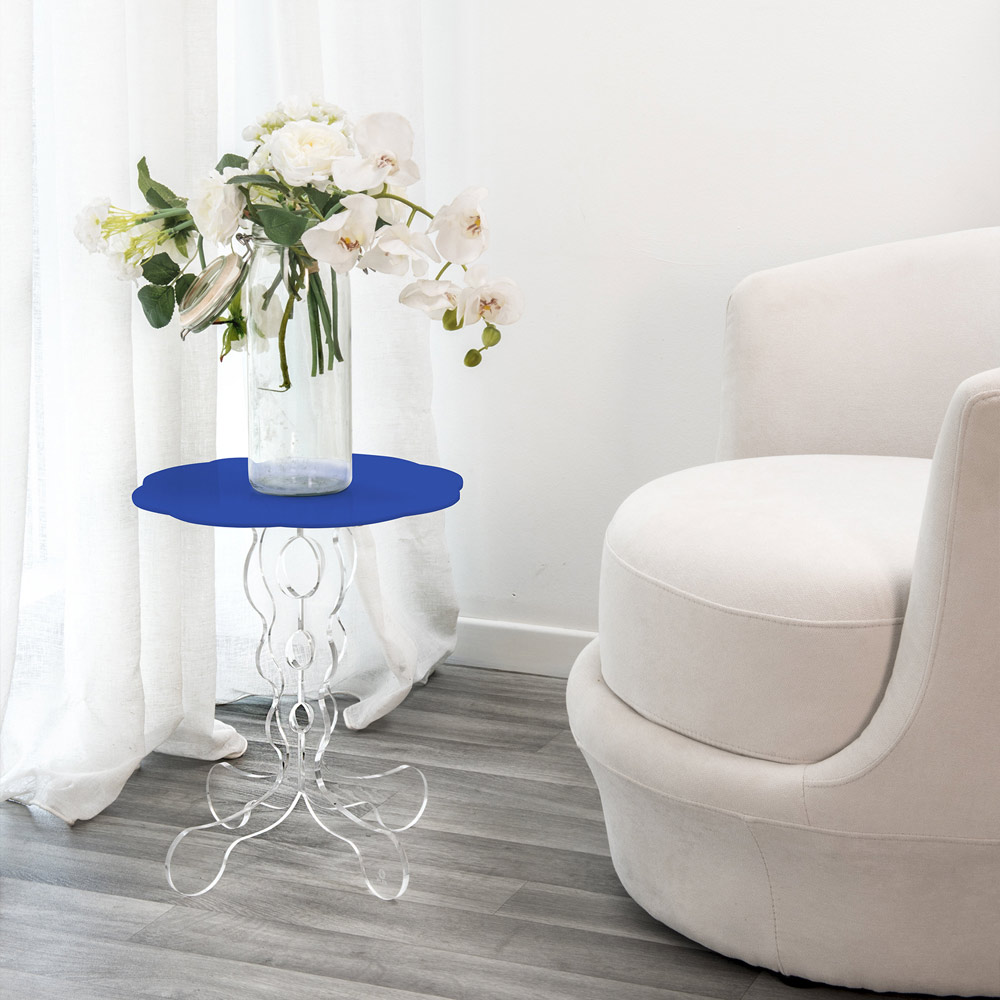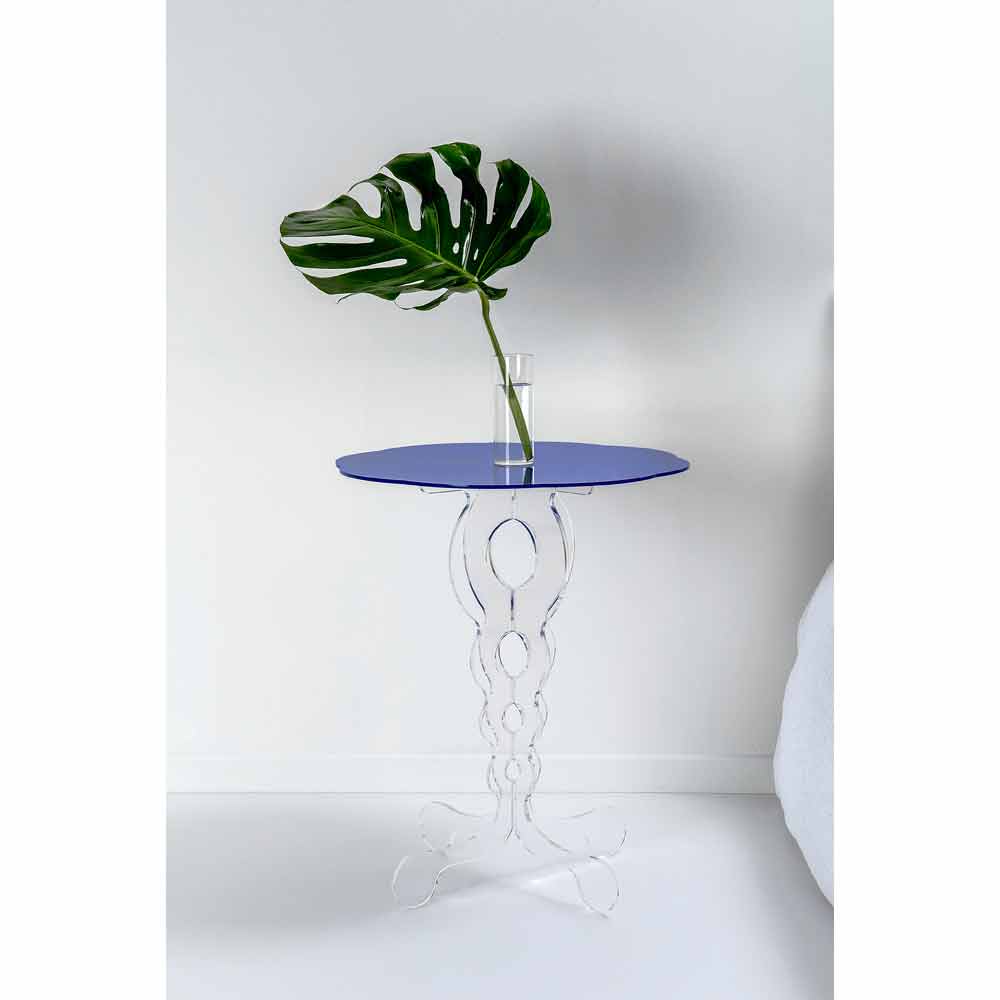 Kleiner runder Tisch blau Durchmesser 50 cm modernes Design Janis, made in Italy Maurische Rückrufe für den Janis-Blautisch: Die 100% PMMA-Plexiglas-Basis aus transparentem, jungfräulichem Polymer, lasergeschnitten, gibt Diskretion, während das blaue Regal mit vollem Pigment der häuslichen Umgebung einen Hauch von Farbe verleiht. Plexiglas ist stoßfest, nicht verformbar, unveränderbar und wärmeisolierend. Die Helligkeit und Helligkeit werden über die Zeit konstant und unverändert beibehalten. PMMA Plexiglas aus reinem Polymer ist ungiftig, hypoallergen, geruchlos und antibakteriell. Entworfen, entworfen und hergestellt in Italien, mit italienischen Materialien.