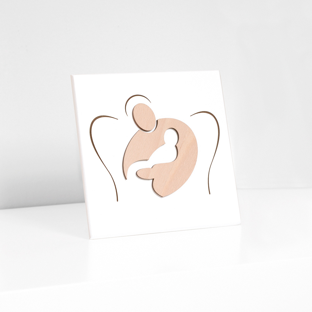 Heiligenbild mit Naturholzapplikation einer Mutter, die ein Kind umarmt, und Lasergravur. Weiß lackierte Holzplatte mit Stützfuß und Loch zum Aufhängen an der Wand.
