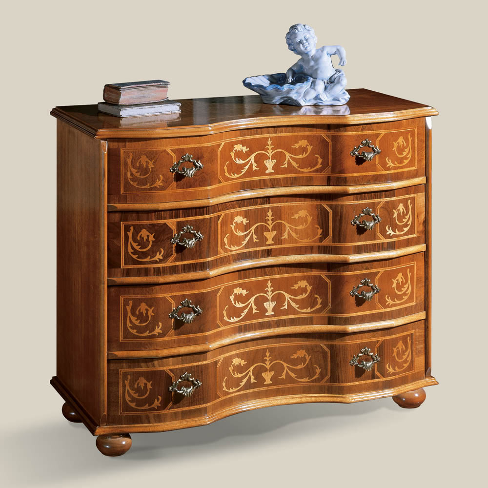 Kommode im klassischen Stil aus edlem poliertem Walnussholz mit goldenen Intarsien . Dieses praktische und raffinierte Möbelstück, das in der Version mit vier oder fünf Schubladen erhältlich ist, wird vollständig in Italien hergestellt und von erfahrenen Handwerksmeistern mit Weisheit und Geschmack für Eleganz handgefertigt. Die Produktion erfolgt unter Verwendung hochwertiger Materialien und mit der größten Sorgfalt und Professionalität, die die Produkte Made in Italyauszeichnet .