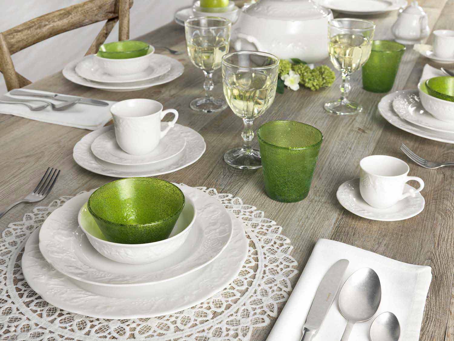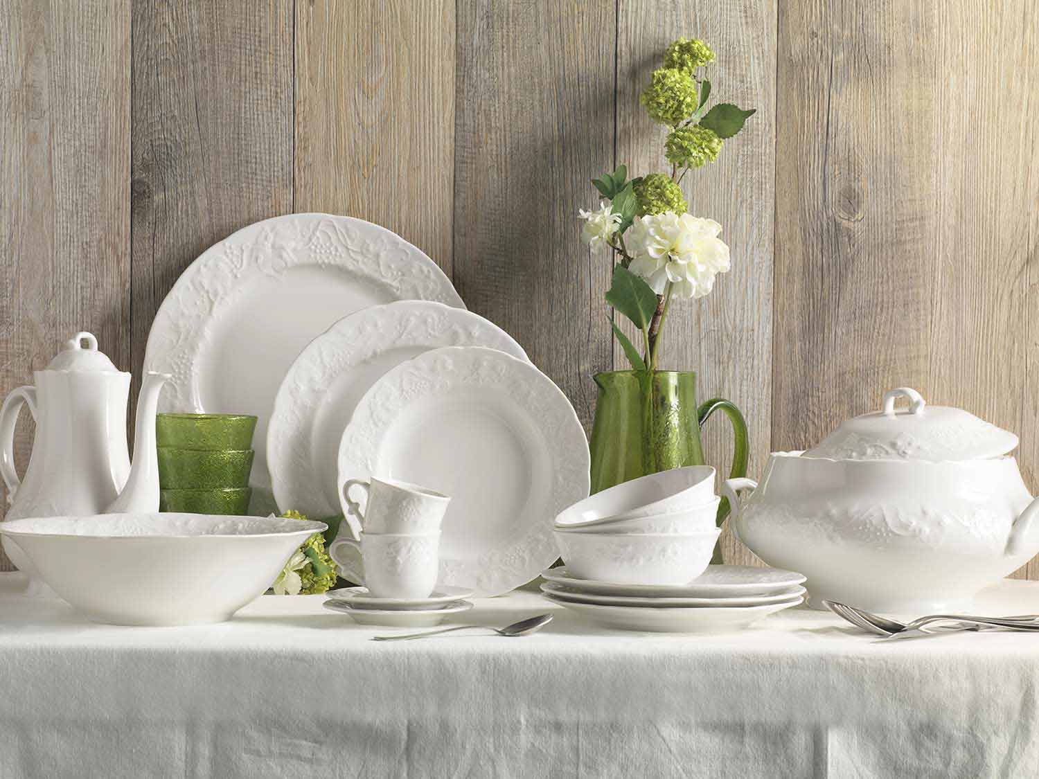 Natürlicher Charme und skulpturale Eleganz im Relief sind die Schlüsselwörter dieser Kreationen aus hellweißem Porzellan und einer künstlerischen Reliefdekoration. Einerseits ein attraktives Design mit mehreren Formen, andererseits die charmante ländlich inspirierte Dekoration.