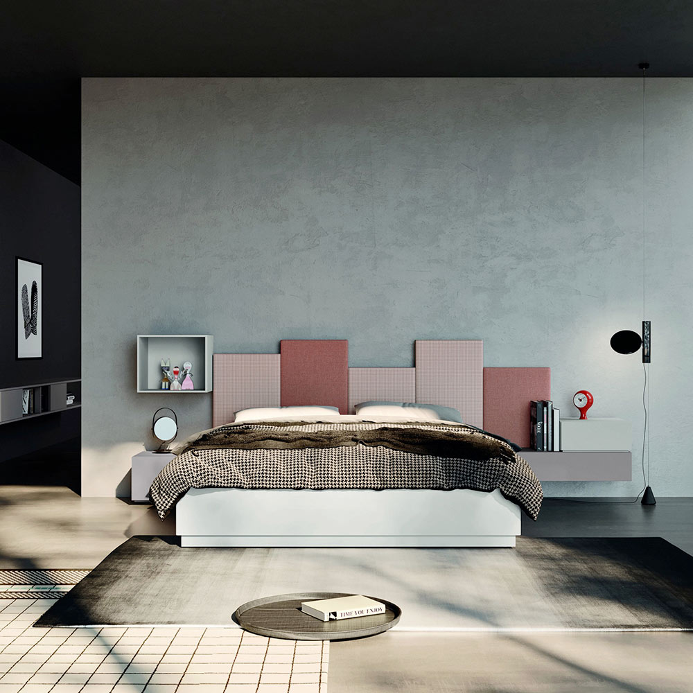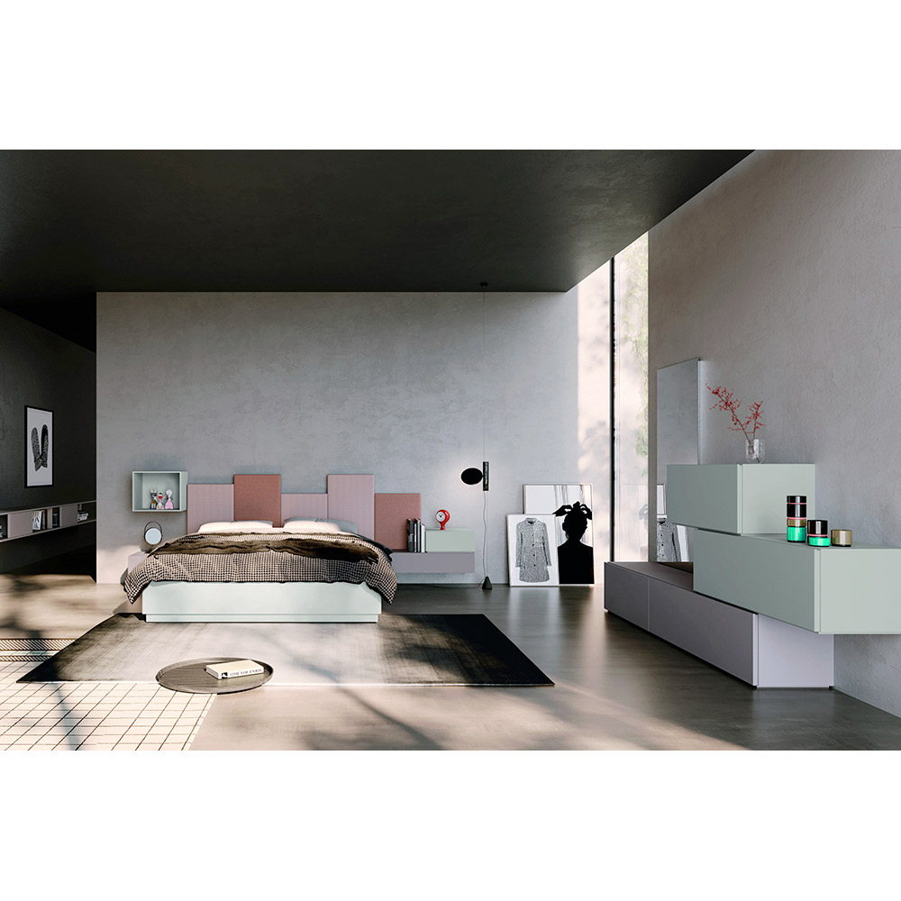 Doppelbett mit einem Bettgestell aus matt lackiertem Holz mit Federn, zwei Nachttische, einer davon modular, eine Kommode, ebenfalls modular, und eine quadratische Wandeinheit aus matt lackiertem Holz mit Federn Hortensien-Finish. Eine Einrichtungsidee, die dank eines