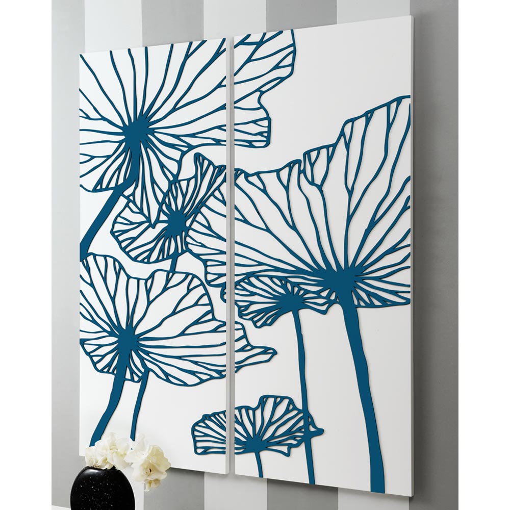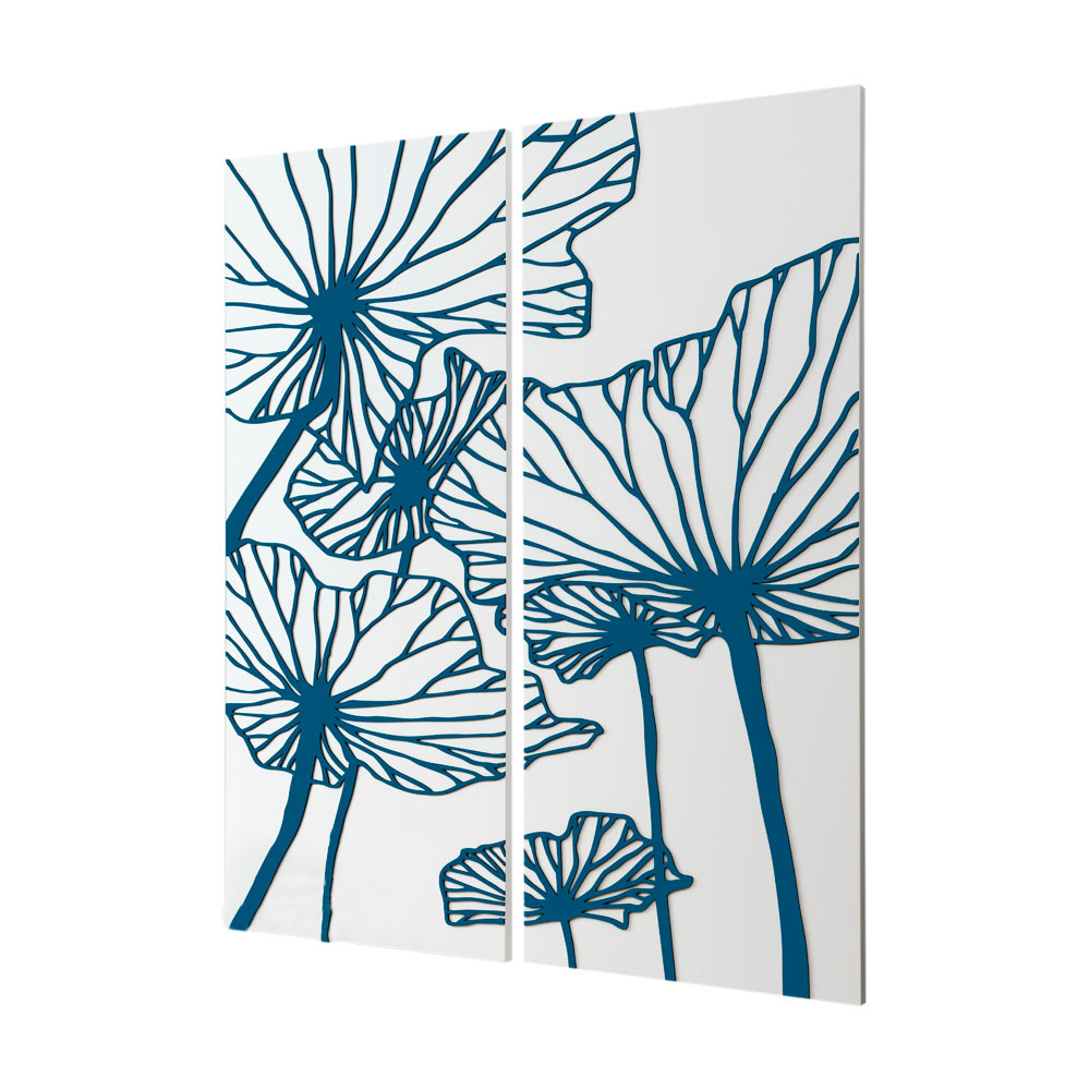 Komposition aus zwei Paneelen aus mattweiß lackiertem Holz mit applizierten, benzinfarbenen Holzdekorationen, die riesige Blumen darstellen.