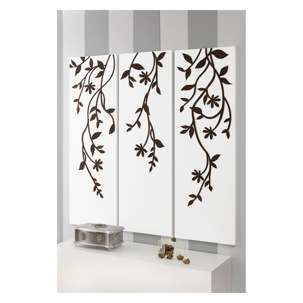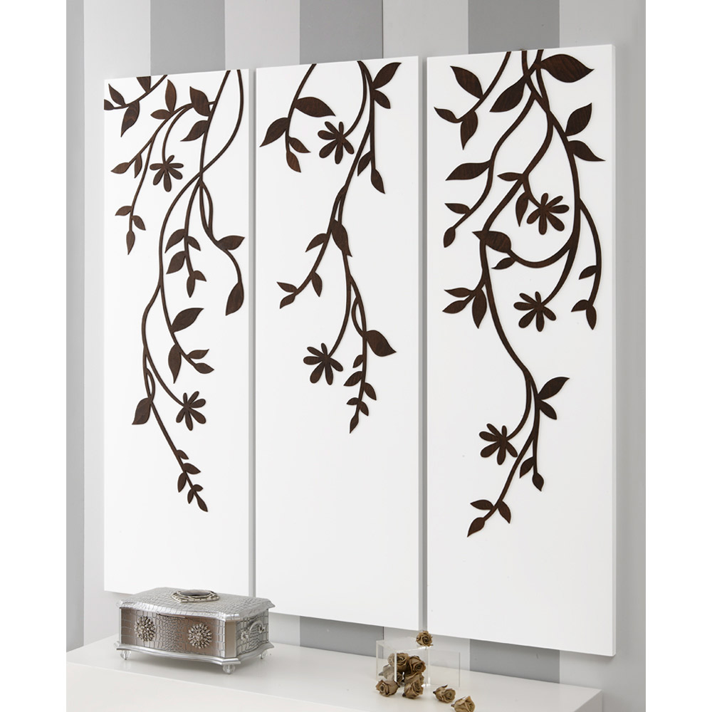 Komposition aus 3 Paneelen zum Einzelaufhängen aus mattweiß lackiertem Holz mit Wengeholzapplikation , die Zweige mit von oben fallenden Blättern darstellt.