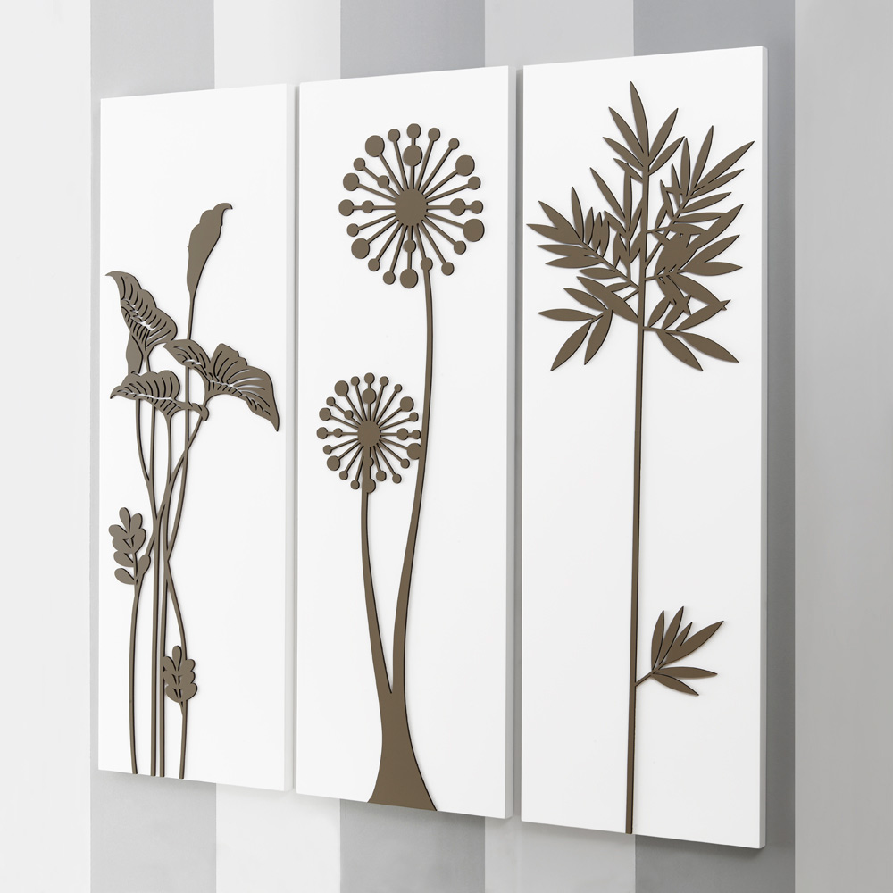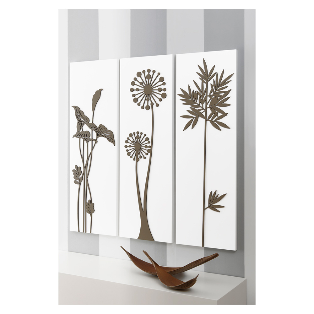 Die Zusammensetzung der Paneele erfolgt mithilfe der Lasermarkierungstechnik , die ein Flachrelief auf dem Material erzeugt und so unterschiedliche Farbabstufungen auf dem Paneel erzeugt. Das Paneel besteht aus weiß lackiertem Holz mit taubengrauem Dekor. Es stellt stilisierte Blumen und Blätter dar, die ein wesentliches Tafeltrio bilden.