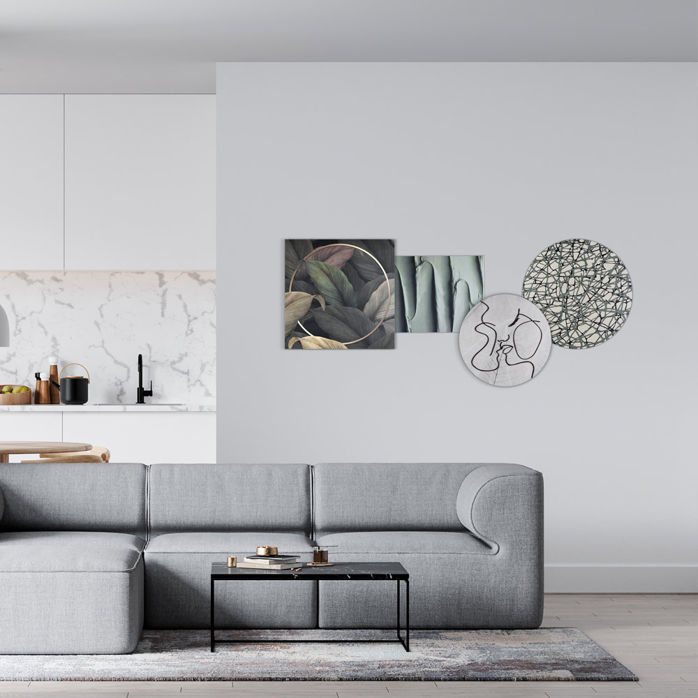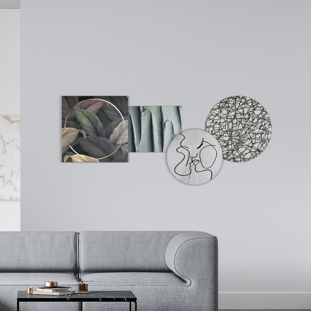 Zusammensetzung aus vier Tafeln unterschiedlicher Form und Größe, die Laser- und Druckdekorationen kombinieren. Bestehend aus vier bedruckten Holztafeln : einer quadratischen mit Blättern, einer rechteckigen mit geschwungenen Linien, einer runden mit der Darstellung des Kusses und einer runden mit ineinander verschlungenen Linien in Grün- und Schwarztönen. Modulare Zusammensetzung : Jedes Paneel ist ein Unikat und kann nach Belieben an der Wand positioniert werden, wodurch ständig wechselnde, überlappende Spiele entstehen. Diese Kombination verleiht dem Raum eine moderne und einzigartige Note. Die Kombination der Oberflächen und Farben jedes einzelnen Paneels schafft eine Kombination, die die unterschiedlichsten Emotionen wecken kann.