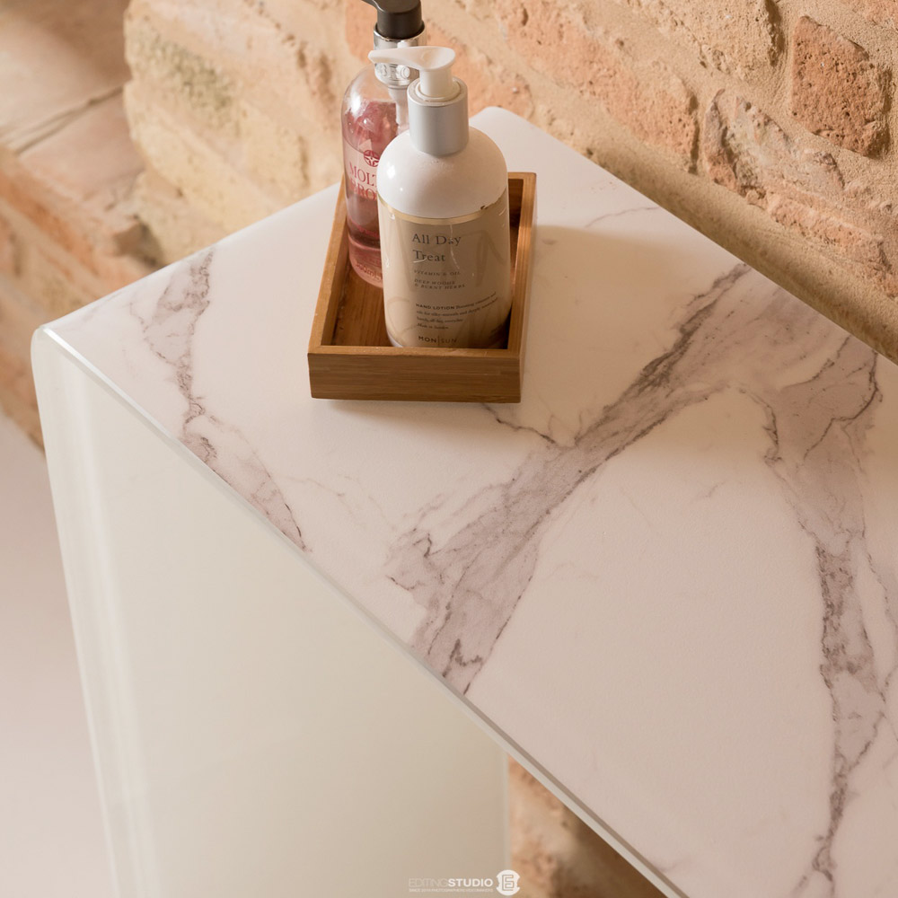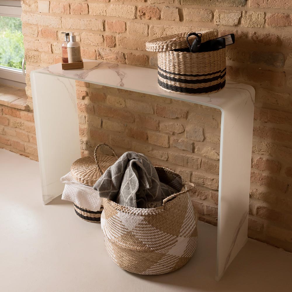 Dieser elegante, moderne Konsolentisch aus 10 mm starkem, gebogenem Sicherheitsglas mit edler Marmoroptik verleiht jedem Raum einen Hauch von Raffinesse und Helligkeit. Die monolithische Struktur unterstreicht die minimalistische Ästhetik des Produkts.