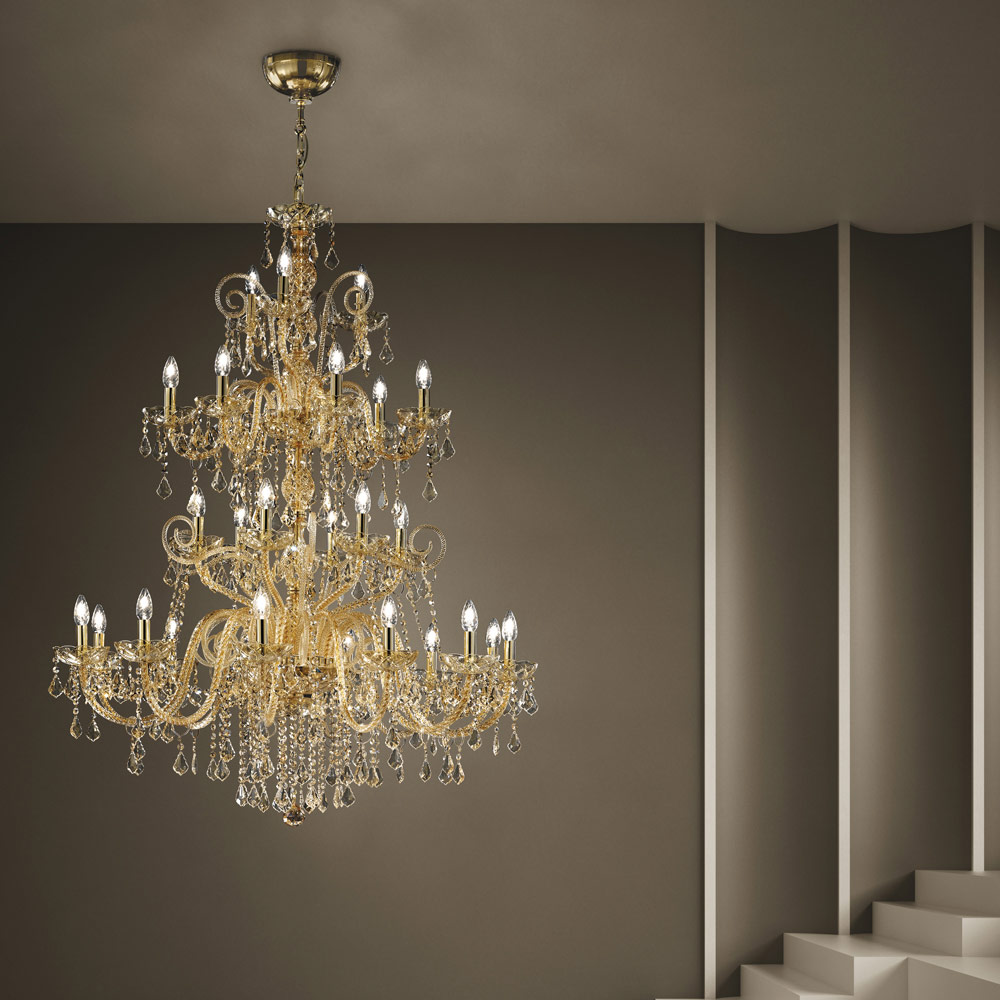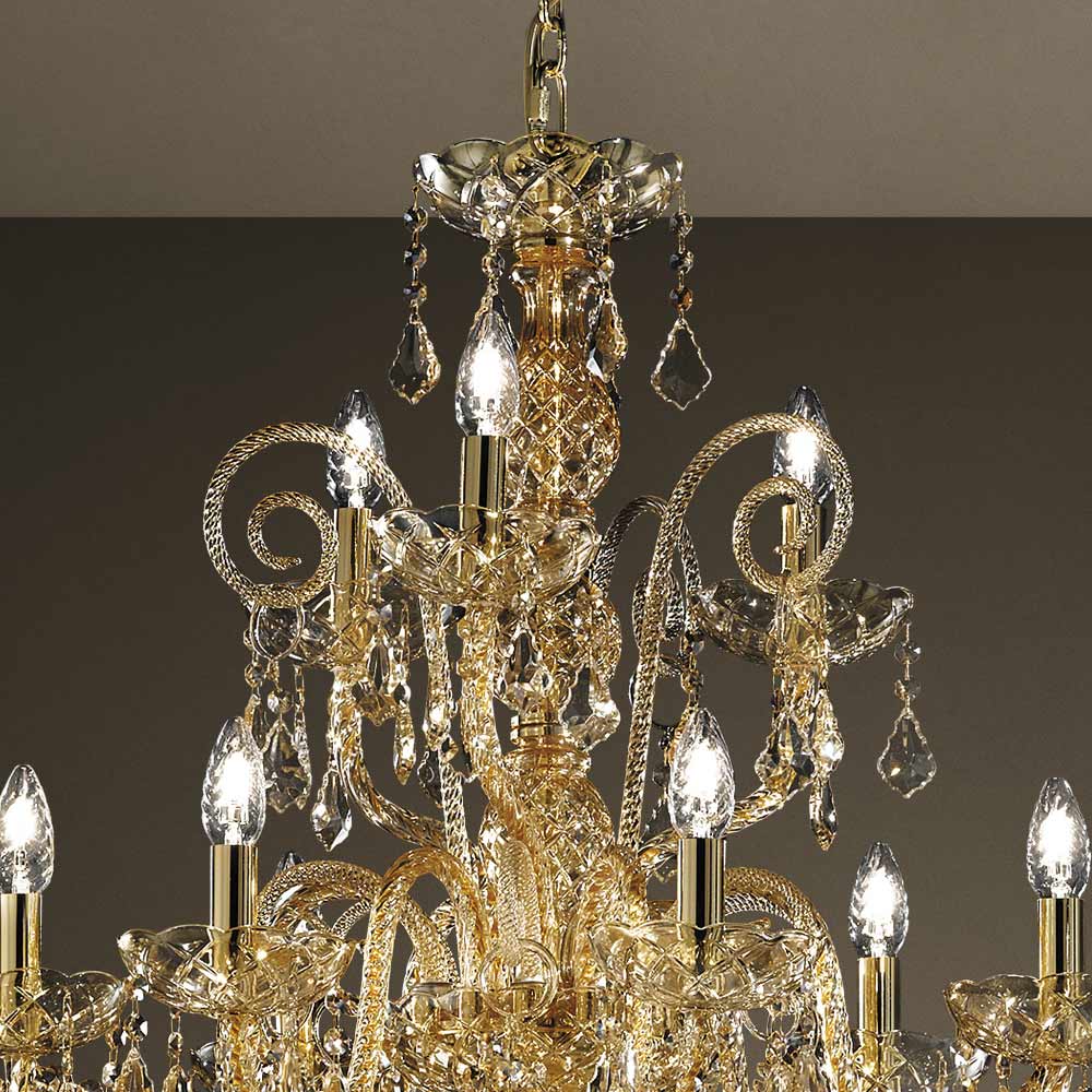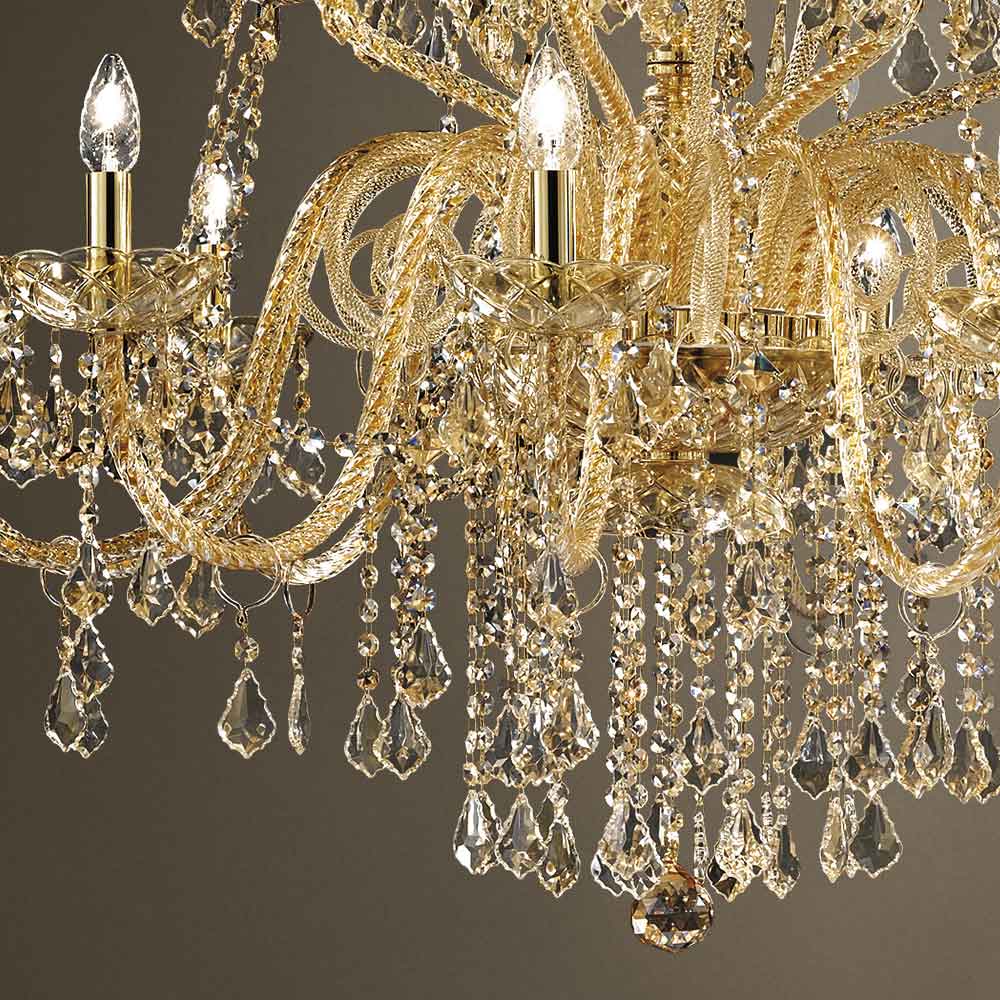 Kronleuchter mit 27 Lichtern aus venezianischem Glas mit bernsteinfarbener Dekoration und nationalen Anhängernund Details aus goldglänzendem Metall . Diese handwerklichhergestellte Ergänzung zeichnet sich durch die wunderbaren Arme aus, die von Hand durch die Verdrehungstechnik bearbeitet wurden, wodurch ein exklusives Ergebnis entsteht, das ästhetisch an die Verflechtung eines Seils erinnert und dem Kronleuchter Persönlichkeit verleiht. Ein echter Lichtregen dringt in die Struktur des Kronleuchters ein und breitet sich dann durch Brechung durch die Magie von Pailletten und Kristallanhängern mit feinen Oberflächen in der Umgebung aus und erzeugt so einen eindrucksvollen und traumhaften szenografischen Effekt , der verzaubern und überraschen kann. für seine Eleganz und Majestät .