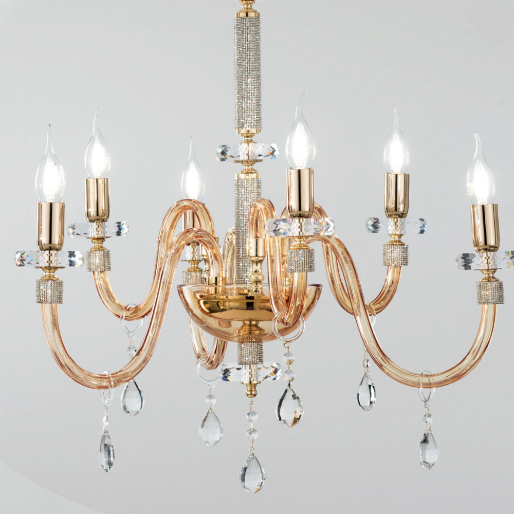 Dieser Hängeleuchter im klassischen Stil besteht aus 6 gewölbten Armen aus handgefertigtem Glas in Italien mit bernsteinfarbenem „Rigaton“-Effekt, deren Ende von in das Metall eingelassenem Glitzer umgeben ist, ebenso wie der mittlere Teil der Ergänzung. wobei zwei kreisförmige Röhrenscheiben die Struktur tragen, dazwischen zwei kreisförmige Scheiben unterschiedlicher Größe aus geschliffenem Kristall.