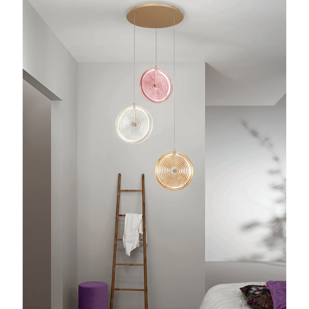 Komplett in Italien hergestellterKronleuchter aus goldfarben lackiertem Metall,mit konzentrischen bernsteinfarbenen, rosafarbenen und transparenten Linien verziertes Glas mit dimmbarem LED- Licht und längenverstellbarem Kabel . Ziel dieses Produkts ist es, die Tradition durch einen zeitgenössischen Ansatz aufzuwerten, bei dem Stil, Klasse und Innovation zu neuen Designformeln verschmelzen, um jede Umgebung mit Geschmack und Charakter einzurichten und zu beleuchten. Stärken sind die Besonderheit der Formen , die Qualität der Materialien und die Einzigartigkeit der Lichtquelle .