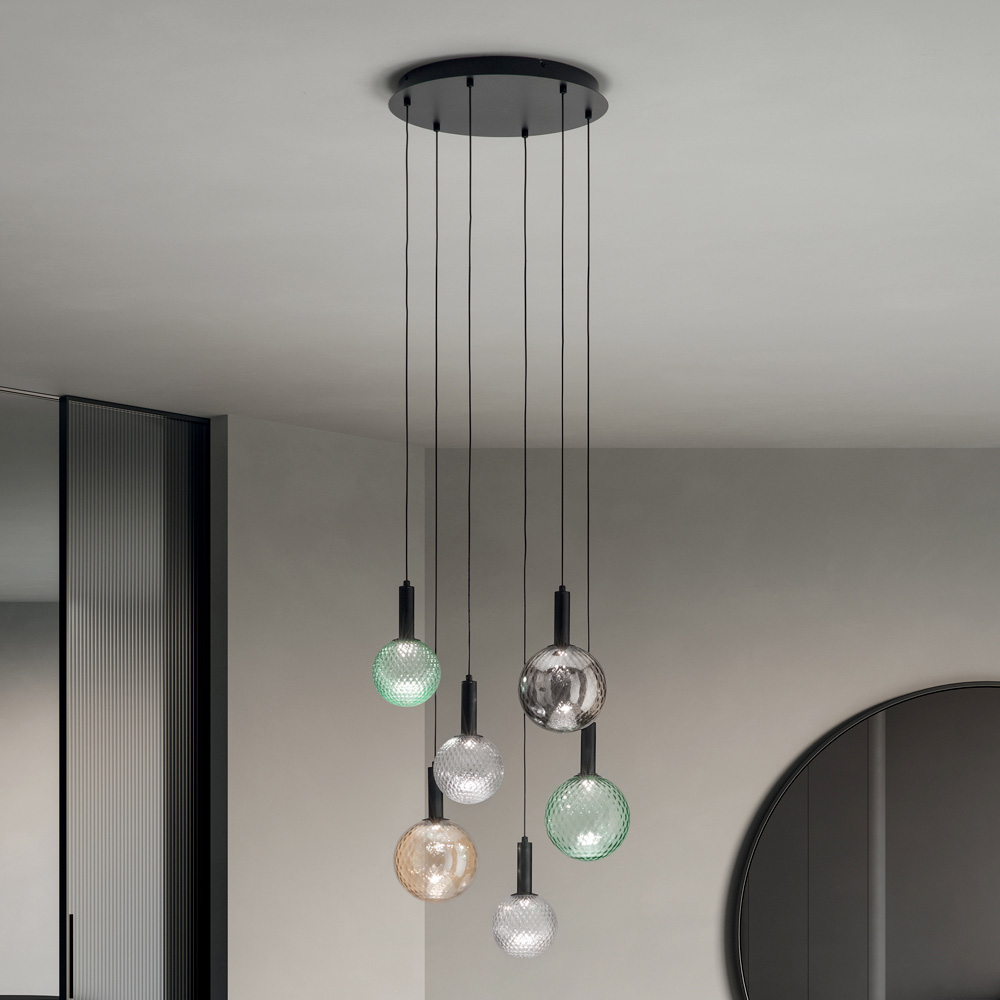 Tauchen Sie ein in die leuchtende Eleganz unserer Pendelleuchte mit mehreren Pendeln, ein wahres Sammlerstück für alle, die modernes Design und Funktionalität zu schätzen wissen. Dieser Kronleuchter mit Glaskugeln mit einzigartigen und abwechslungsreichen Texturen projiziert ein Lichtspiel, das jede Umgebung mit einem warmen und einladenden Licht bereichert.