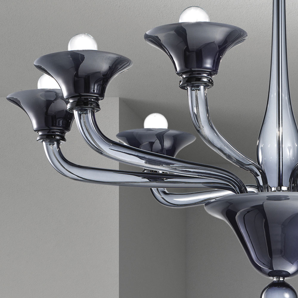 In Italien handgefertigter Kronleuchter aus venezianischem Glas mit milchweiß-grauem Finish mit Metalldetails in poliertem Chrom-Finish . Eine beispiellose Begegnung zwischen historischen Linien und zeitgenössischem Design , um einem Möbelstück mit zeitlosem Charme und Eleganz Leben einzuhauchen. Ihre Ästhetik zeichnet sich durch ein gegliedertes Volumen aus, das durch die leuchtende Vibration der wunderbaren mundgeblasenen Glasflächen dynamisch und leicht wird, die die eleganten transparenten Arme mit den Schalen abwechseln, die durch die Verwendung der Gehäusetechnik hergestellt werden . Seine Wertigkeit wird durch die Liebe zum Detail unterstrichen, die von den verchromten Metallkomponenten ausgeht, die es dem Produkt ermöglichen, sich an unterschiedliche Geschmäcker und Anwendungssituationen anzupassen.