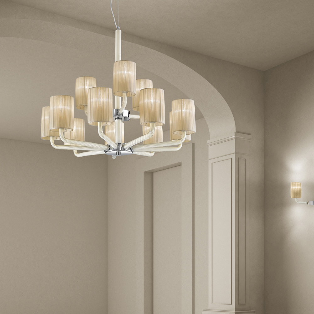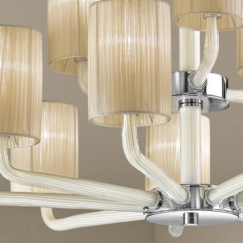 Kronleuchter mit 12 Lichtern, handgefertigt in Italien aus venezianischem Glas mit milchweißem Elfenbein-Finish mit Metalldetails in poliertem Chrom-Finish und eleganten Lampenschirmen aus Stoff . Ein Möbelstück, das sich durch ein gegliedertes, aber essentielles Design auszeichnet und dank seiner starken Bühnenpräsenz , die für die klassischen Kronleuchter der Vergangenheit typisch ist, in der Lage ist, die Umgebung zu bereichern und Charakter zu verleihen. Die röhrenförmigen Glasarme stützen auf zarte und elegante Weise die wunderbaren Lampenschirme aus Stoff, die dabei helfen, das Licht in alle Richtungen für eine warme , weiche und einhüllende Beleuchtung zu tragen.