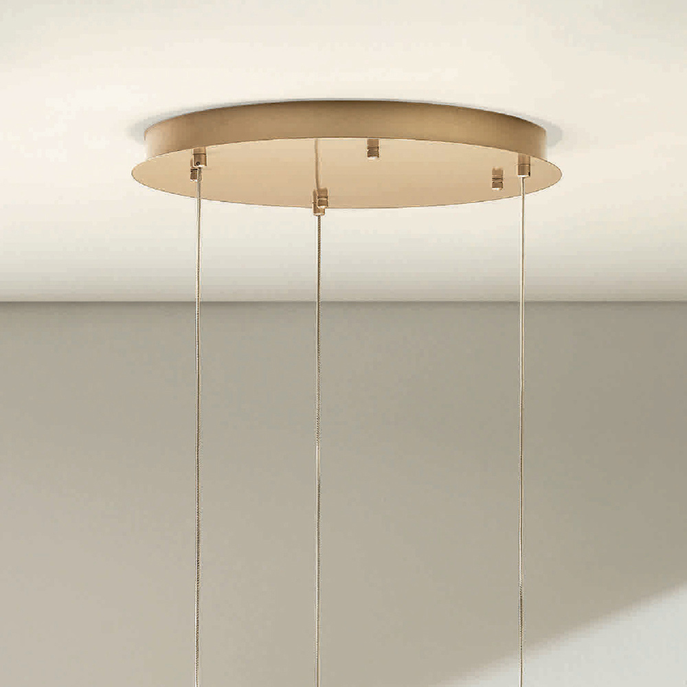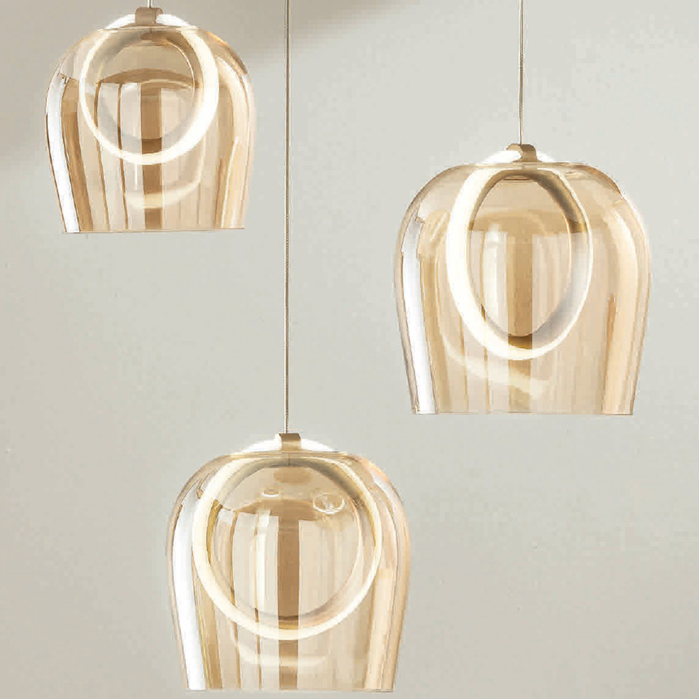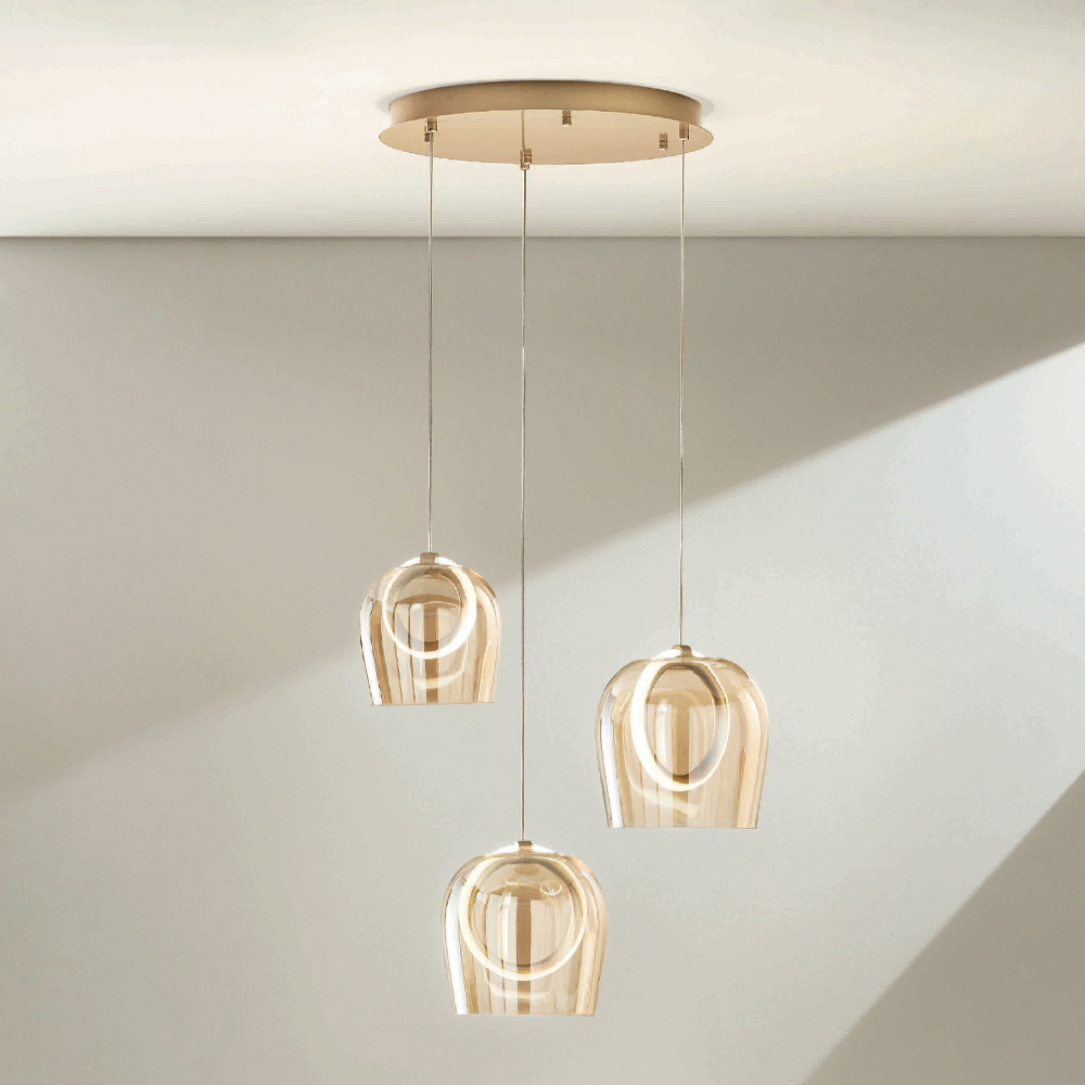 Komplett in Italien hergestellterKronleuchter aus goldfarben lackiertem Metall mit verstellbaren Kabeln in der Länge und 3 dimmbaren LED-Leuchten mit optionalem Lampenschirm aus bernsteinfarbenem Glas . Ziel dieses Produkts ist es, die Tradition durch einen zeitgenössischen Ansatz aufzuwerten, bei dem Stil, Klasse und Innovation zu neuen Designformeln verschmelzen, um jede Umgebung mit Geschmack und Charakter einzurichten und zu beleuchten. Stärken sind die Besonderheit der Formen , die Qualität der Materialien und die Einzigartigkeit der Lichtquelle .