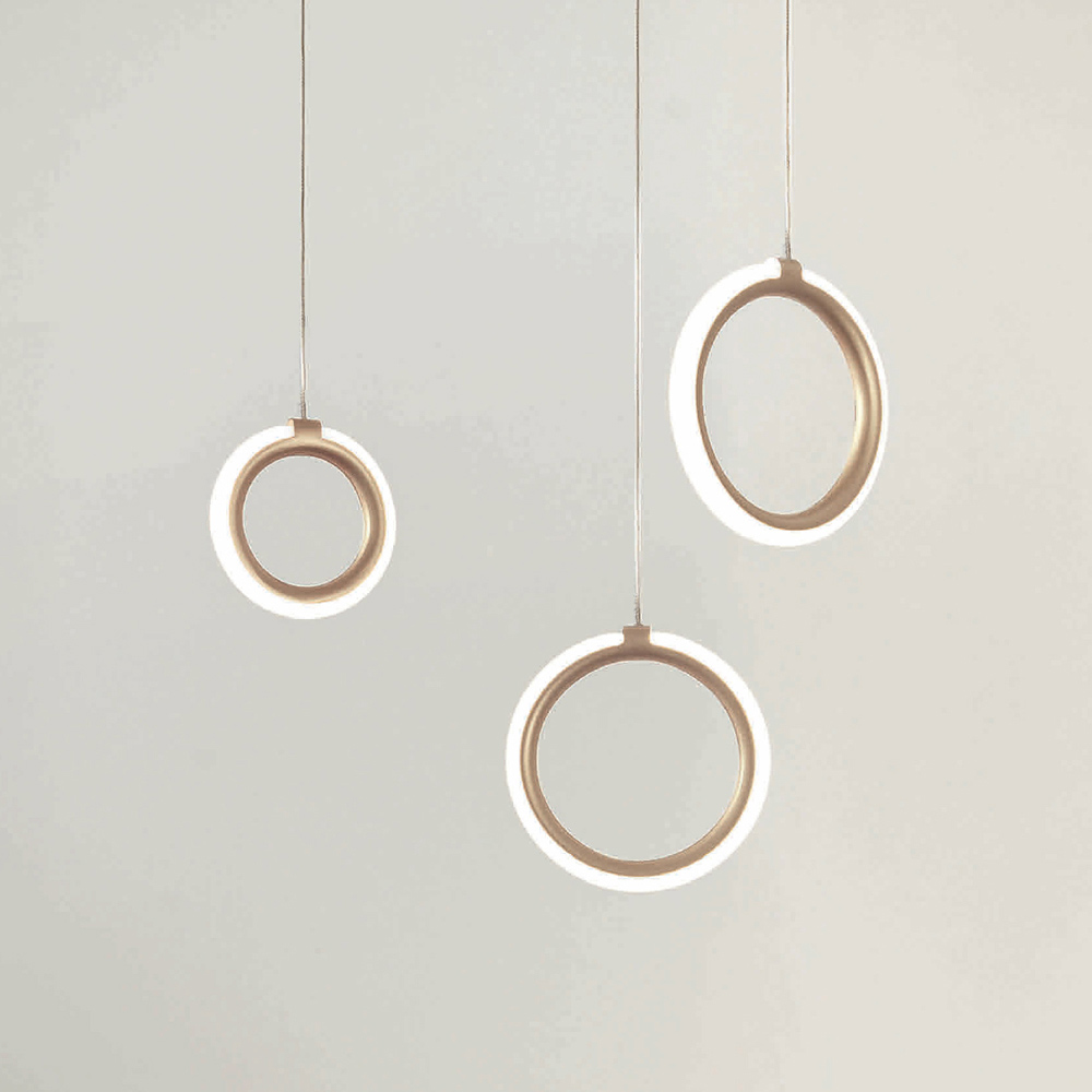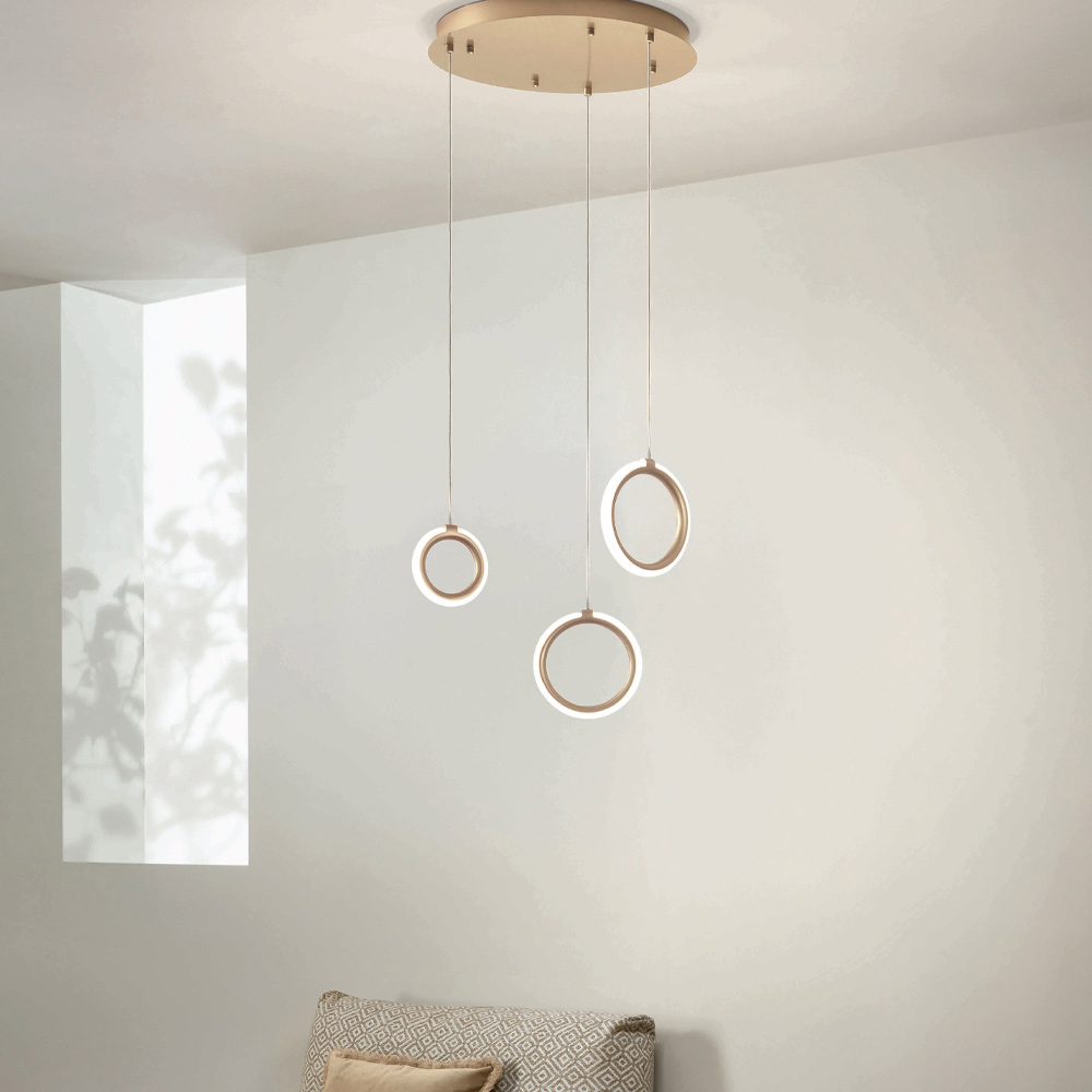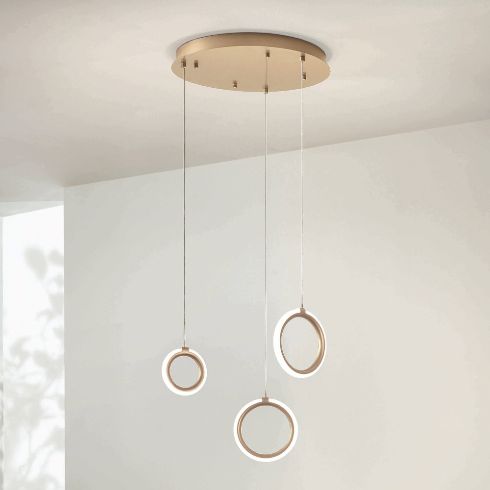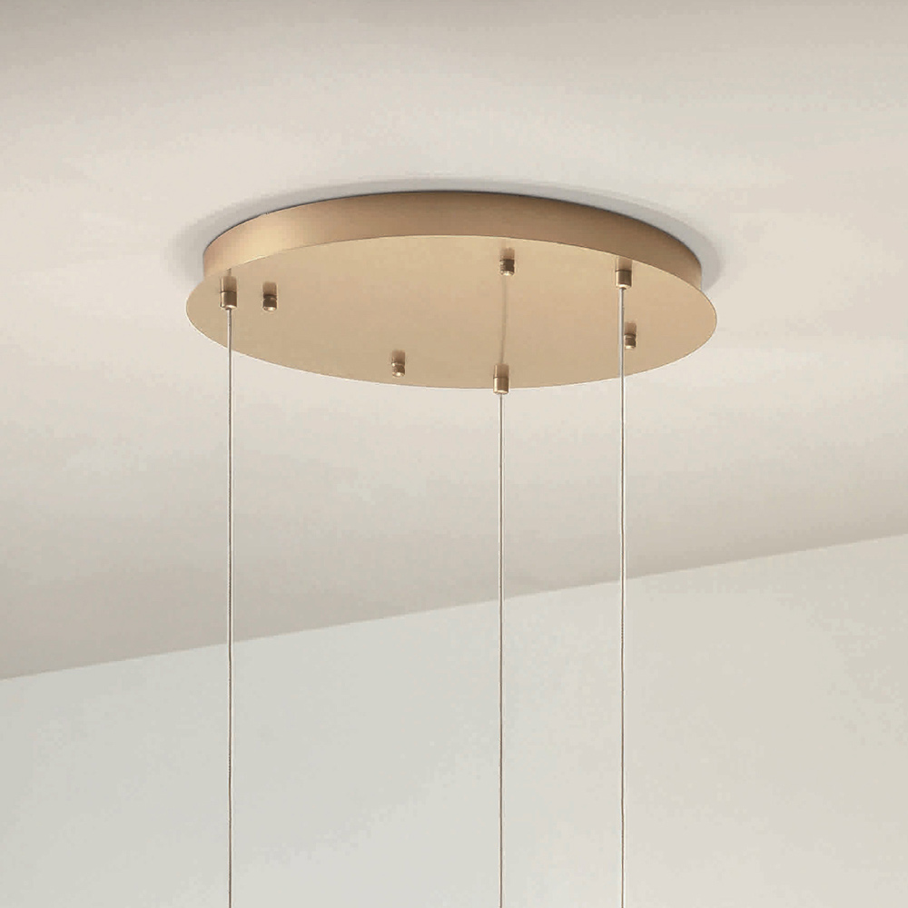 Komplett in Italien hergestellterKronleuchter aus goldfarben lackiertem Metall mit verstellbaren Kabeln in der Länge und 3 dimmbaren LED-Leuchten mit optionalem Lampenschirm aus bernsteinfarbenem Glas . Ziel dieses Produkts ist es, die Tradition durch einen zeitgenössischen Ansatz aufzuwerten, bei dem Stil, Klasse und Innovation zu neuen Designformeln verschmelzen, um jede Umgebung mit Geschmack und Charakter einzurichten und zu beleuchten. Stärken sind die Besonderheit der Formen , die Qualität der Materialien und die Einzigartigkeit der Lichtquelle .