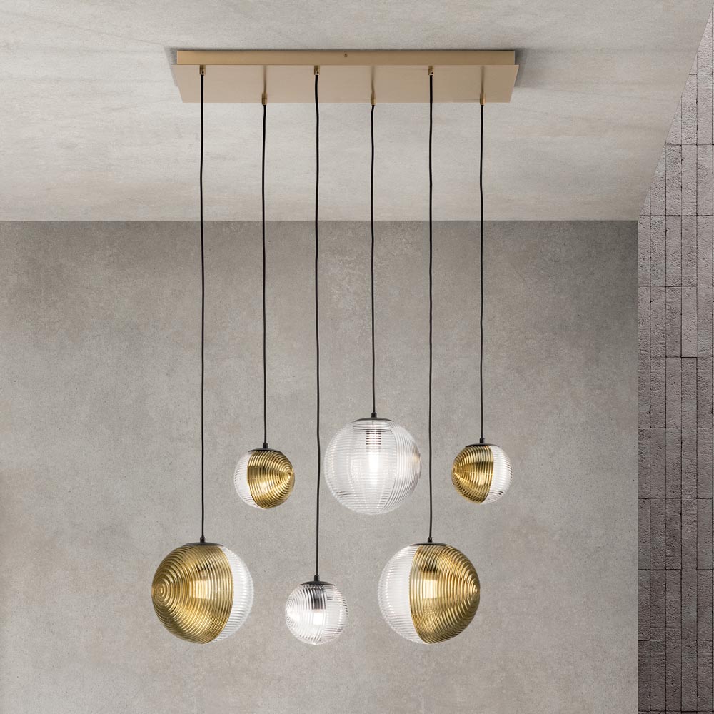 Tauchen Sie mit diesem Hängeleuchter in eine Atmosphäre moderner Eleganz ein, die jedem Raum einen Hauch von dezentem Luxus verleiht. Die leuchtenden Kugeln hängen in einem harmonischen Tanz aus Licht und Reflexionen , jede in mundgeblasenem Glas mit unterschiedlichen Oberflächen eingeschlossen, und reflektieren ein warmes und einladendes Licht .