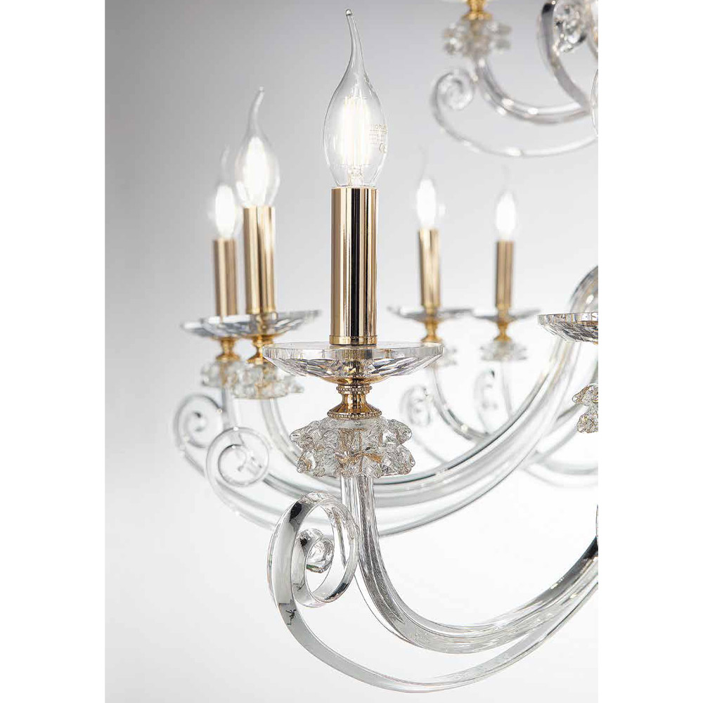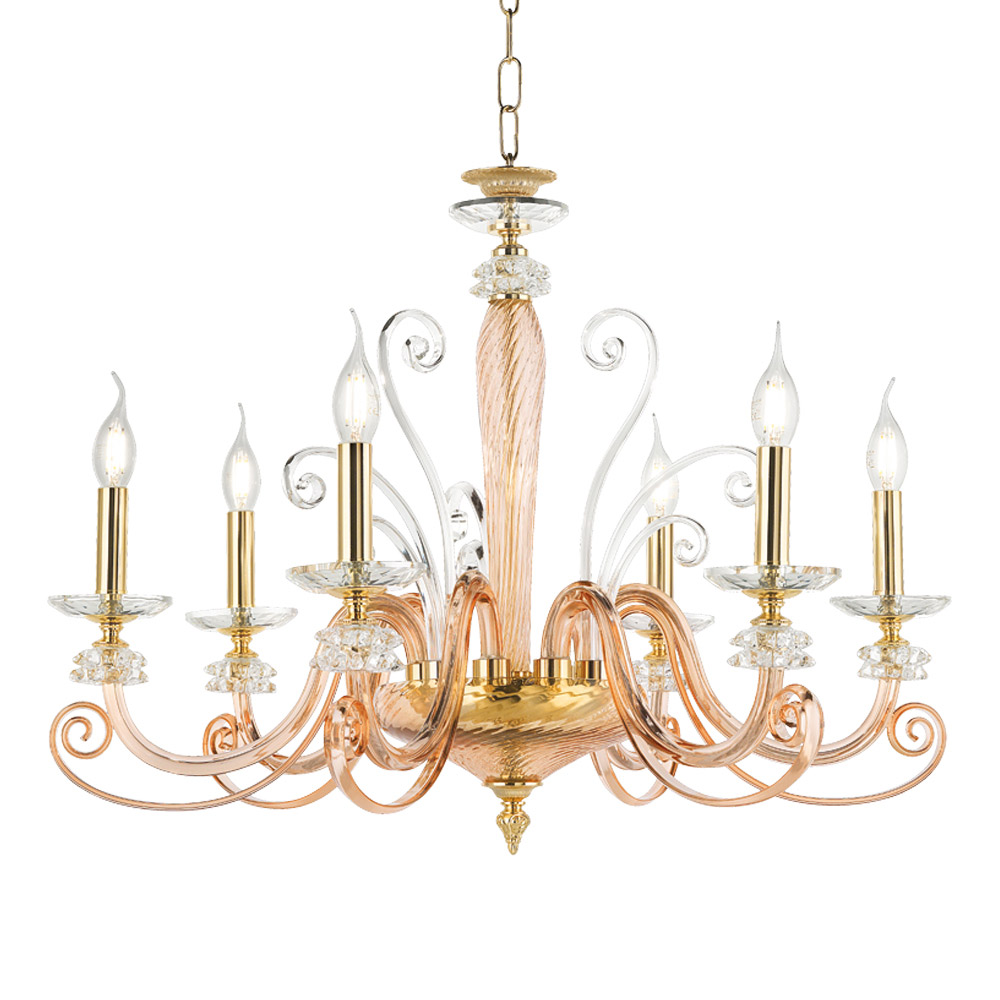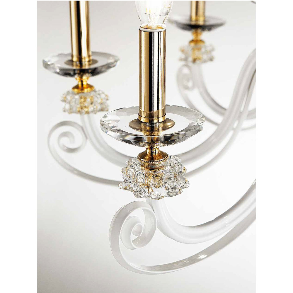 Der 6-Licht- Kronleuchter ist ein luxuriöses Beleuchtungszubehör , das vollständig in Italien handgefertigt wird und eine Struktur mit metallischen Oberflächen kombiniert mit mundgeblasenem Glas und hochwertigem optischem Kristall aufweist. So erwacht das Design im klassischen Stil vergangener Zeiten zum Leben, dessen Charme zum Protagonisten im Zielraum wird.