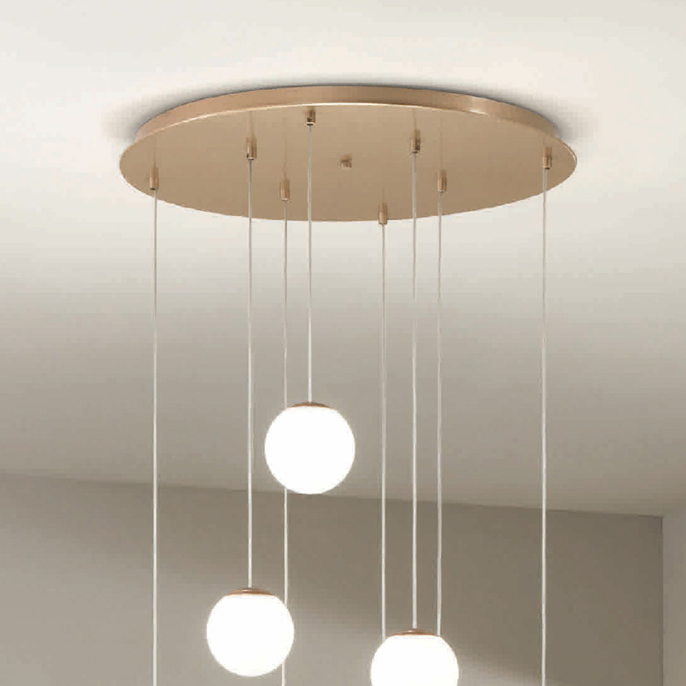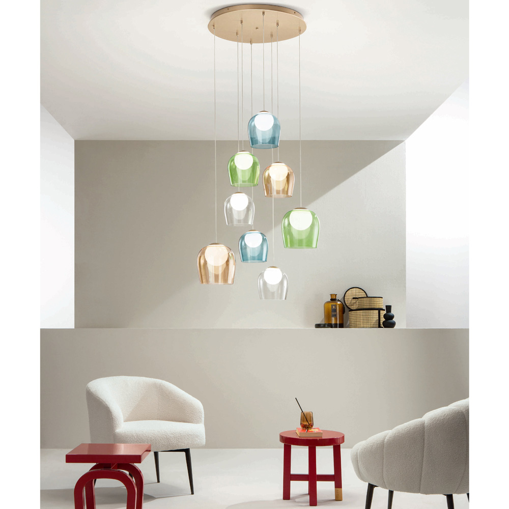 Komplett in Italien hergestellterKronleuchter aus goldfarben lackiertem Metall und 8 LED-Leuchten mit optionalem Lampenschirm aus farbigem Glas , der durch Abschrauben der Glaskugel entfernt werden kann. Ziel dieses Produkts ist es, die Tradition durch einen zeitgenössischen Ansatz aufzuwerten, bei dem Stil, Klasse und Innovation zu neuen Designformeln verschmelzen, um jede Umgebung mit Geschmack und Charakter einzurichten und zu beleuchten. Stärken sind die Besonderheit der Formen , die Qualität der Materialien und die Einzigartigkeit der Lichtquelle .