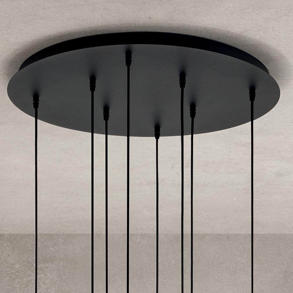 Kronleuchter aus geblasenem Glas in Kugelform mit halbkugelförmiger Linie, die in zwei Teile geteilt ist: einen transparenten und einen farbigen. Rahmen aus mattschwarz lackiertem Metall und Deckensockel aus schwarzem Metall . Verstellbare Kabel mit einer maximalen Länge von 250 cm.