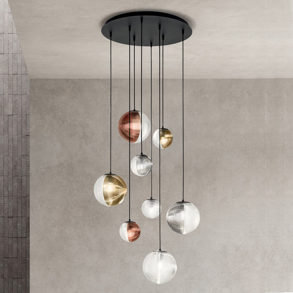 Tauchen Sie mit diesem Hängeleuchter in eine Atmosphäre moderner Eleganz ein, die jedem Raum einen Hauch von dezentem Luxus verleiht. Die leuchtenden Kugeln hängen in einem harmonischen Tanz aus Licht und Reflexionen , jede in mundgeblasenem Glas mit unterschiedlichen Oberflächen eingeschlossen, und reflektieren ein warmes und einladendes Licht .