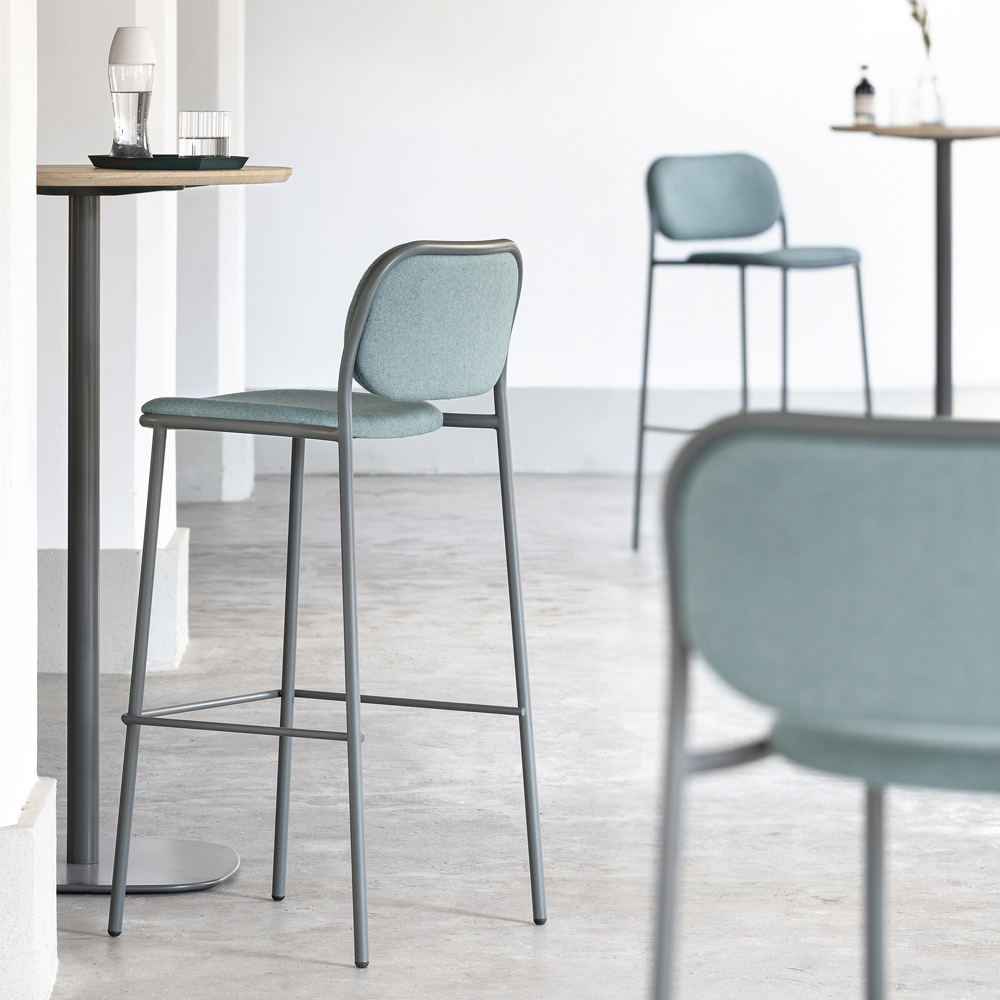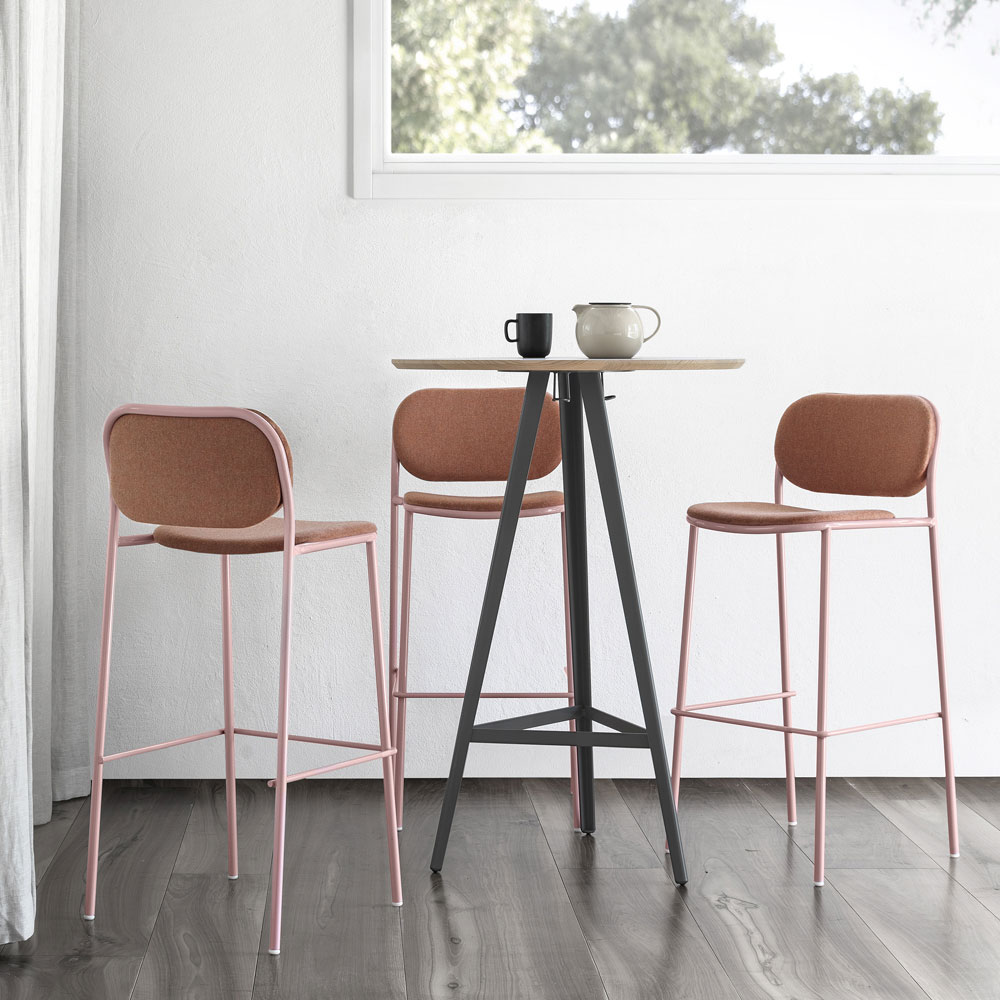 Die chromatische Vielfalt der vorgeschlagenen Stoffe zusammen mit den wunderbaren Nuancen für die Struktur bietet auch die Möglichkeit, mit der Fantasie für kreative, raffinierte und extravagante Farbkombinationen zu spielen, die in der Lage sind, die Innenräume zu koordinieren und dank der Persönlichkeit und Materialität des Stuhls die Umgebung zu charakterisieren . . Die Möglichkeit des Stapelns betont auch seine funktionale Seite und macht ihn zu einer perfekten Lösung auch für Objektumgebungen wie Bars und Restaurants, wo es wichtig ist, den Raum optimieren zu können, wenn die Hocker nicht verwendet werden.