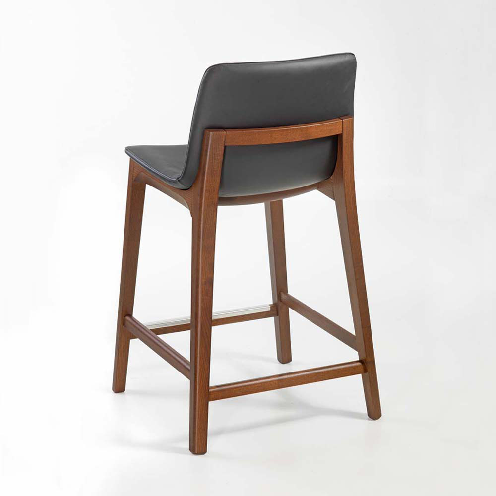 Vollständig in Italien hergestellter Küchenhocker mit Sitz aus schwarzem Leder und Gestell aus mittelwalnussfarben gebeizter Esche . Sein charakteristisches Merkmal ist die Holzstruktur, die die Rückenlehne umhüllt, ein Detail, das dieses Modell einzigartig und sehr elegant macht. Hocker mit modernem Design mit einfachen und weichen Oberflächen , perfekt für alle, die ihre Wohnumgebung gerne mit Geschmack und Stil einrichten, ohne auf Funktionalität und Komfort zu verzichten.