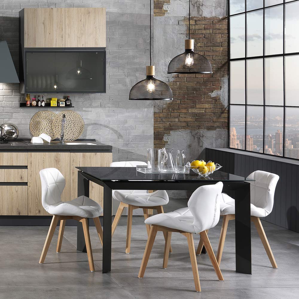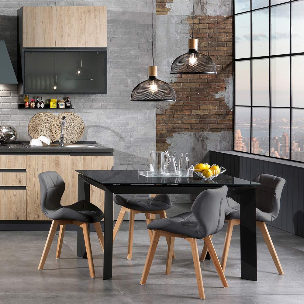 Küchen- oder Esszimmerstuhl mit Sitz aus Kunstleder mit geometrischem Muster und Beinen aus Massivholz mit Eichenfinish . Dieses Möbelstück trägt dazu bei, den Stil Ihres Hauses mit einem modernen und raffinierten Designzu vervollständigen und gleichzeitig dank seiner exklusiven und eleganten Ästhetik der Umgebung Persönlichkeit und Charakter zu verleihen.