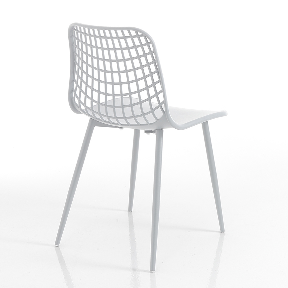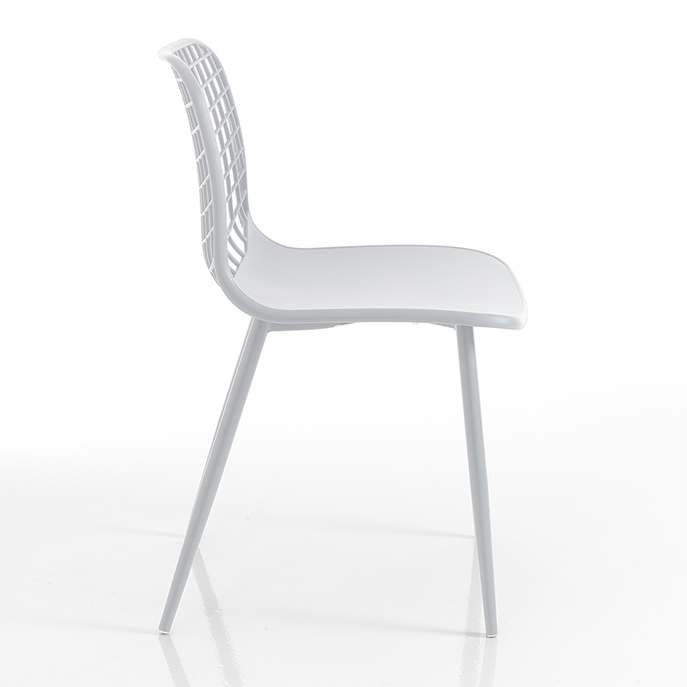 Küchenstuhl mit Sitzschale aus opakweißem Polypropylen und Beinen aus Stahl mit Schutzlack für die Außenseite in opakweiß beschichtet. Ein einfacher und minimalistischer Sitz, dessen Ästhetik durch die besondere Verarbeitung bereichert und einzigartig wird, die die Rückenlehne auszeichnet und ihre Einzigartigkeit unterstreicht. Das Ergebnis ist ein besonders vielseitiger Stuhl, der sich ideal für die unterschiedlichsten Wohnumgebungen eignet, aber auch für Objektbereiche wie Bars und Restaurants, wo er den Möbeln einen Hauch von Originalität verleiht.