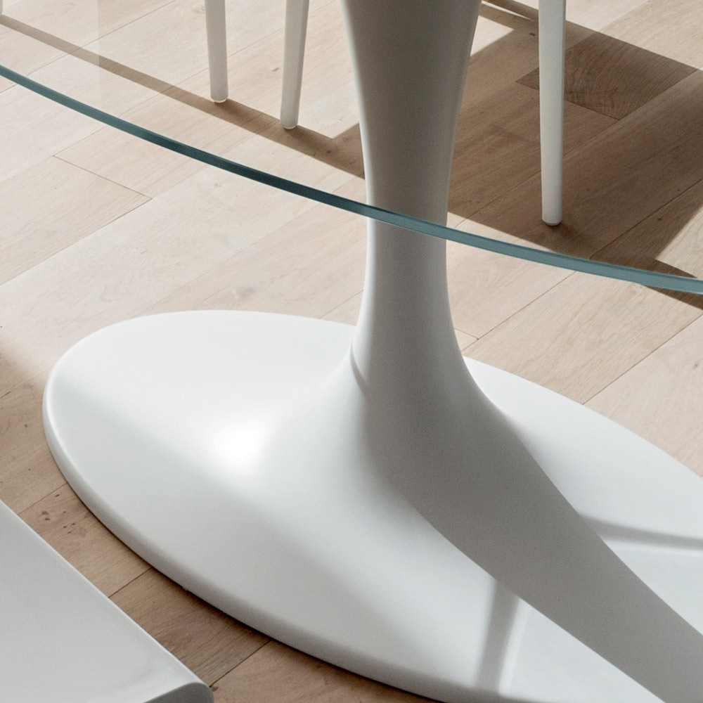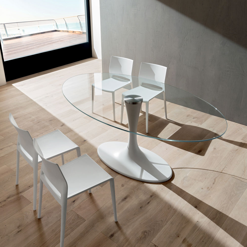 In Italien hergestellter Esstisch mit ovaler Platte aus gehärtetem Glas (Stärke 12 mm) glänzend transparent mit geklebtem Stahlflansch und Sockel aus Mineralmarmor (synthetischer Marmor), ein Material, das durch Mischen von Marmorpulver gewonnen wird. Aus der Begegnung zwischen hochwertigen Rohstoffen und originellen Formen entsteht eine äußerst kreative Einrichtungslösung, die jedes Esszimmer oder jede Küche zu einer fast futuristischen Umgebung macht. Was seine Ästhetik auszeichnet und ihn zu einem einzigartigen Produkt seiner Art macht, ist der Sockel aus synthetischem Marmor, der nicht nur eine hervorragende Stabilität bietet, sondern ihn auch mit seiner starken modernen Persönlichkeit zusammen mit der Glasplatte bereichert, die besonders vielseitig und gleichzeitig elegant ist . Das Endergebnis ist ein eklektisches und ungewöhnliches Möbelstück, ideal für diejenigen, die es lieben, ihre Wohnräume mit avantgardistischen und raffinierten Elementen auszustatten, die dank ihrer revolutionären Seele Aufmerksamkeit erregen, um so eine wunderbare Harmonie der Stile zu schaffen.
