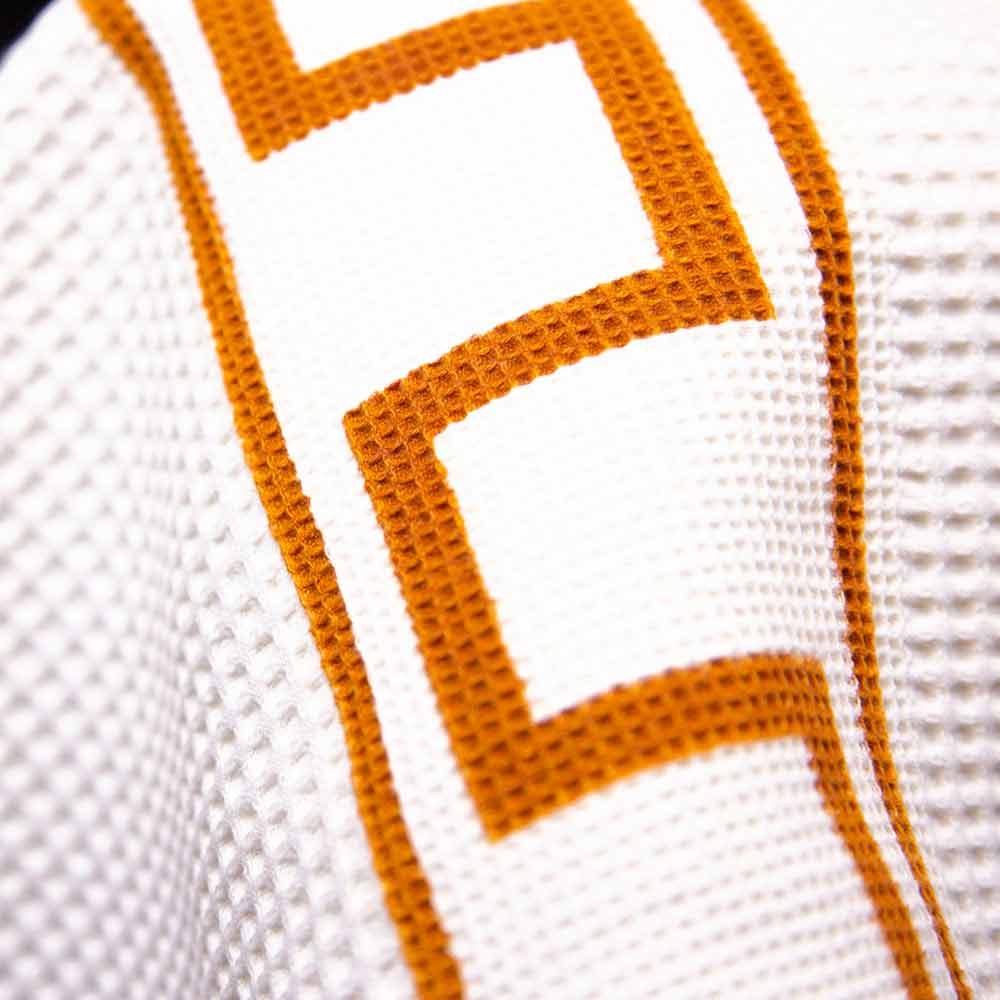 Badetuch aus reinweißer Wabenbaumwolle mit rostfarbenem pompejischem griechischen Druck, handgefertigt, handgefertigte Kreation made in Italy Unikat.