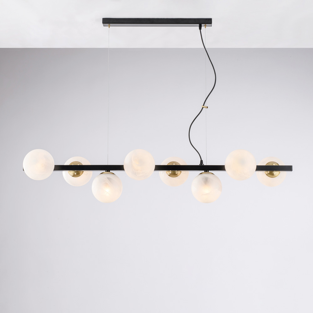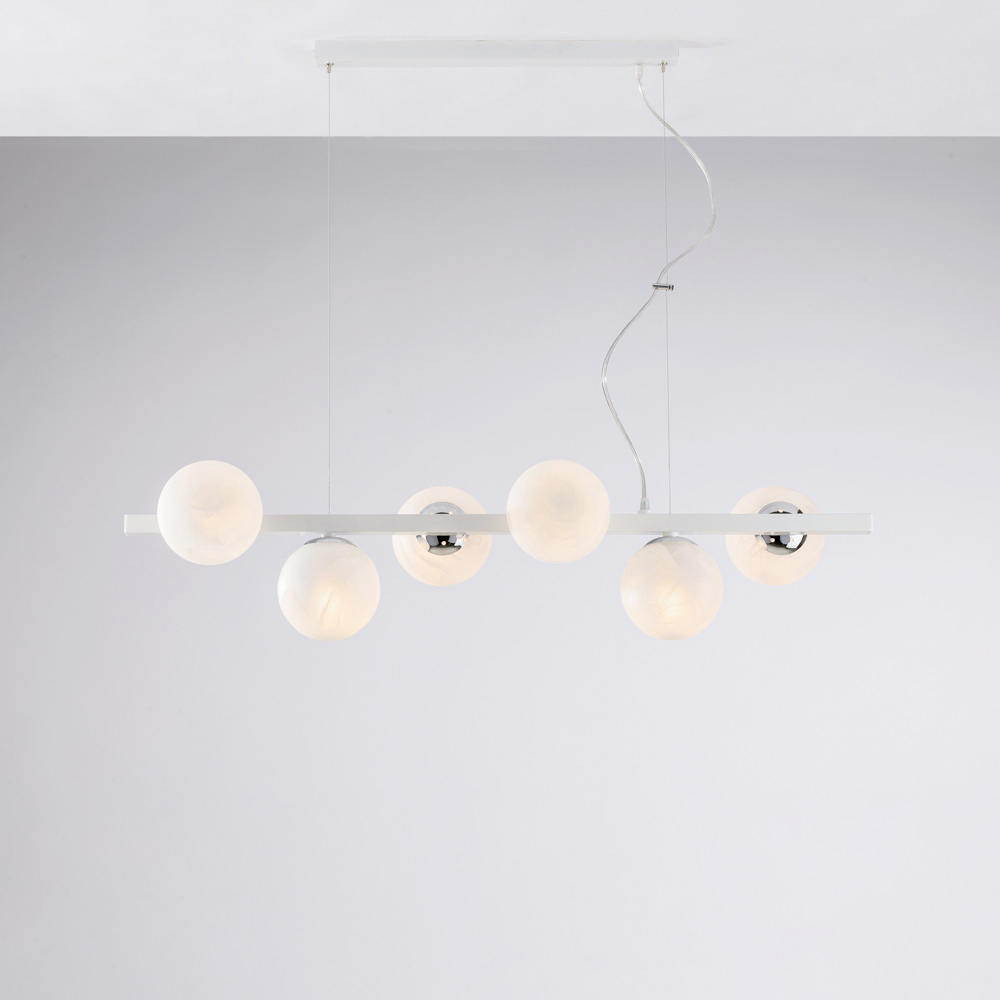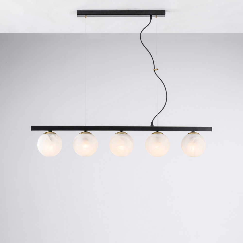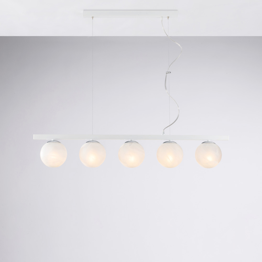 Modern, elegant und optisch beeindruckend: Diese handgefertigte Pendelleuchte aus Eisen wurde entworfen, um zeitgenössische Räume mit einem diffusen, stimmungsvollen Licht zu bereichern. Die lineare Struktur, die durch die angeordneten Leuchtkugeln zusätzlich betont wird, schafft eine perfekte Balance zwischen geometrischer Strenge und optischer Weichheit.