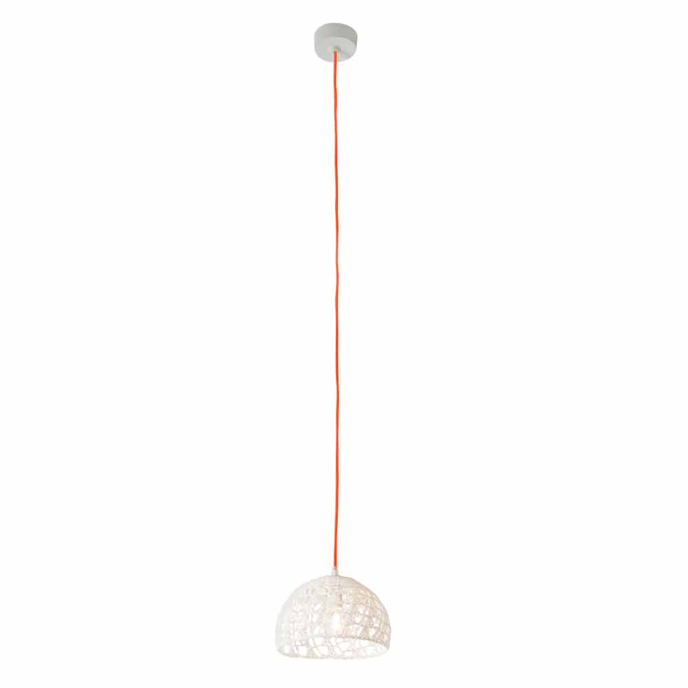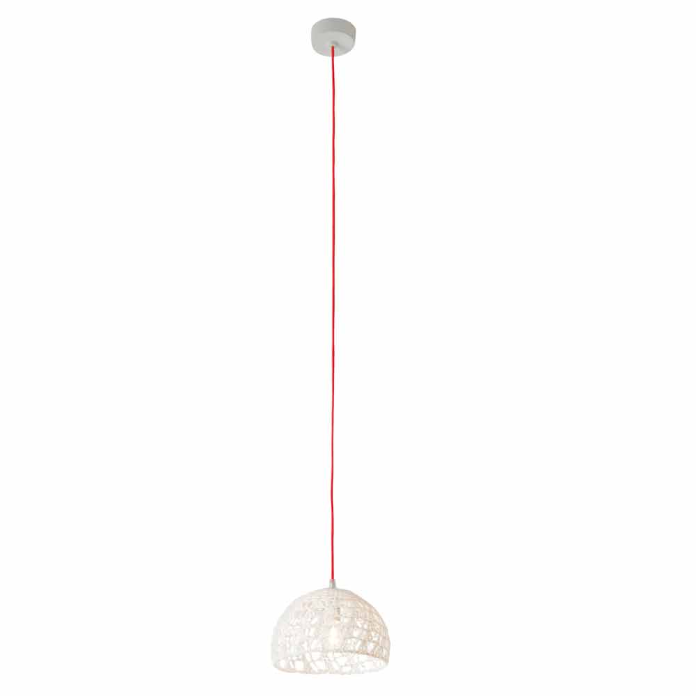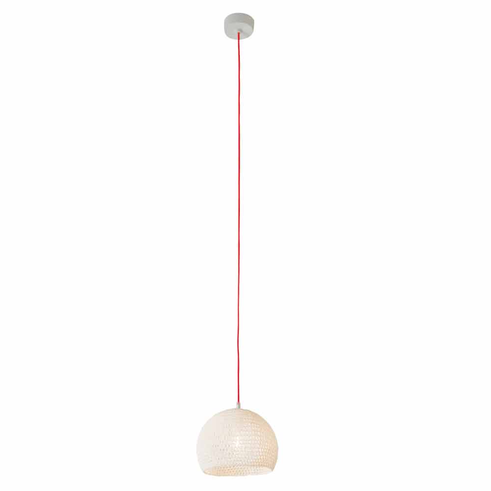 Seine aus Baumwolle und Viscona handgefertigte Strickstruktur ist mit weißem Harz bedeckt. Der Hauch von Farbe verleiht ihm das elektrische Kabel, das in sechs verschiedenen Farben und zwei verschiedenen Größen erhältlich ist: Farben: - weiße, gelbe Schnur; - weißes, rotes Kabel; - weißes, blaues Kabel; - weiße, weiße Schnur; - weiße, goldene Schnur; - weiße, orangefarbene Schnur. Maße: - Ø 21 x H 16 cm Rosette Ø 9 x 4 cm; - Ø 21 x H14 cm Rosette Ø 9x4 cm.
