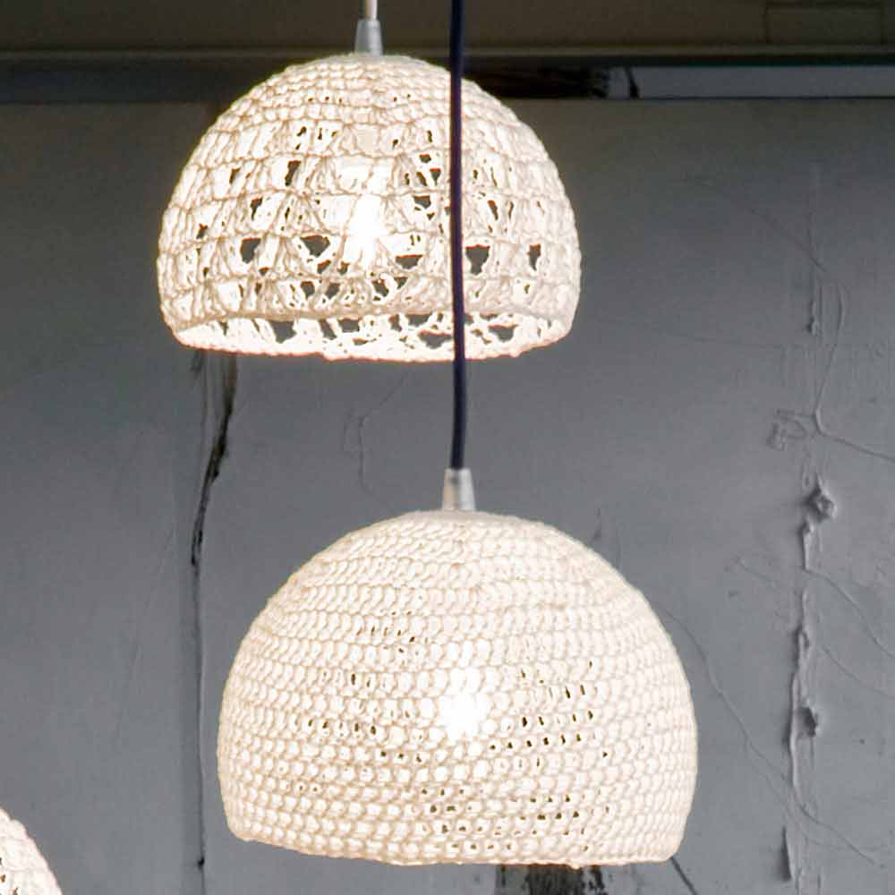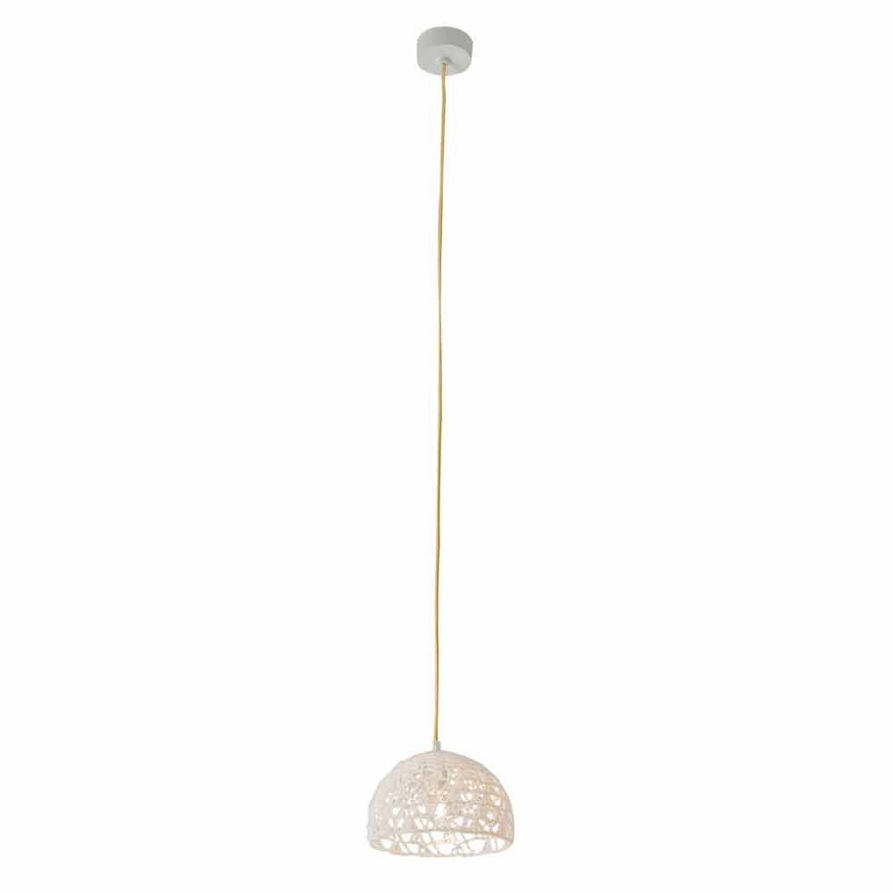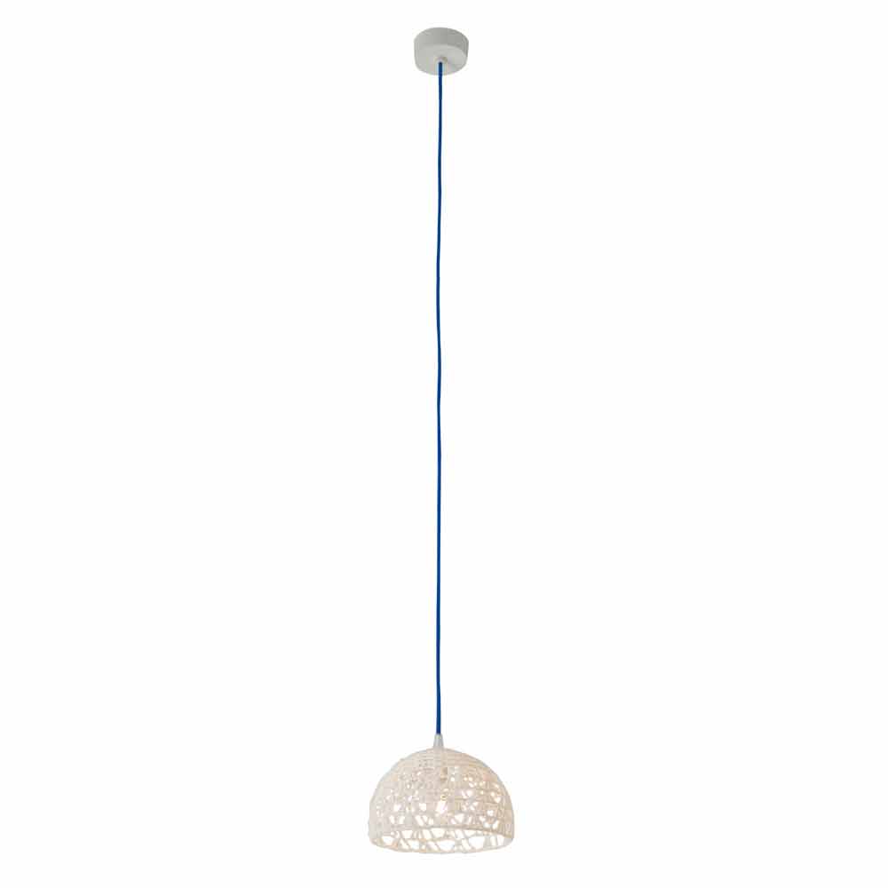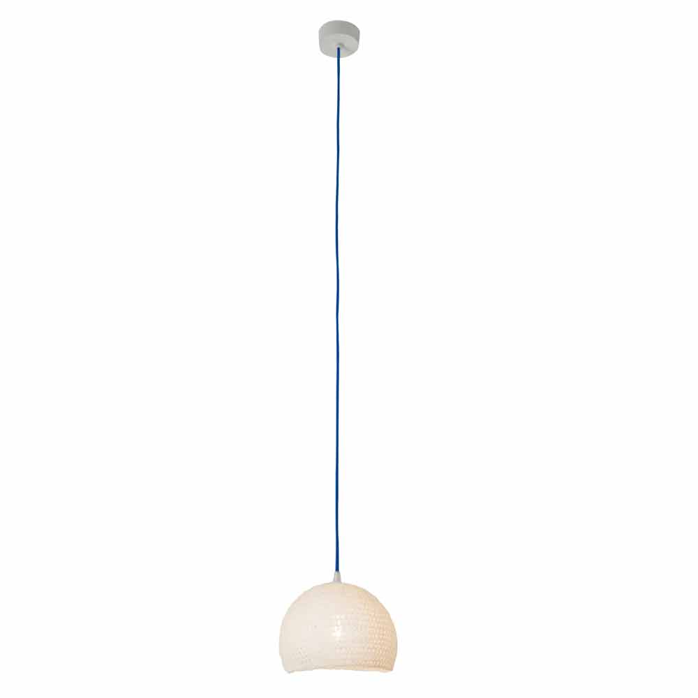 Seine aus Baumwolle und Viscona handgefertigte Strickstruktur ist mit weißem Harz bedeckt. Der Hauch von Farbe verleiht ihm das elektrische Kabel, das in sechs verschiedenen Farben und zwei verschiedenen Größen erhältlich ist: Farben: - weiße, gelbe Schnur; - weißes, rotes Kabel; - weißes, blaues Kabel; - weiße, weiße Schnur; - weiße, goldene Schnur; - weiße, orangefarbene Schnur. Maße: - Ø 21 x H 16 cm Rosette Ø 9 x 4 cm; - Ø 21 x H14 cm Rosette Ø 9x4 cm.