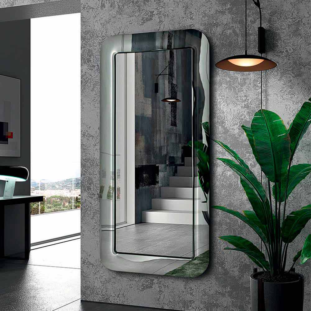 RechteckigerWandspiegel mit Rahmen, hergestellt in ItalienKomplett aus 6 mm starkem, gebogenem Glas in verspiegelter Kristalloptik gefertigt. Dieses wundervolle Designobjekt hat eine äußerst einfache und lineare Struktur, ist aber dank der Verarbeitung, die den Rahmen auszeichnet, gleichzeitig einzigartig und raffiniert. Letzteres wird auch durch die Details der 4 abgerundeten Ecken bereichert, die dem Produkt Harmonie und Feinheit verleihen. Dieser Wandspiegel mit imposanten Abmessungen eignet sich ideal zum Füllen großer leerer Räume und spielt eine zentrale Rolle in Räumen mit moderner Einrichtung, die eine vielseitige Lösung mit einer starken Persönlichkeit erfordern, die ihr Erscheinungsbild bereichert und ihren ästhetischen Wert erhöht.