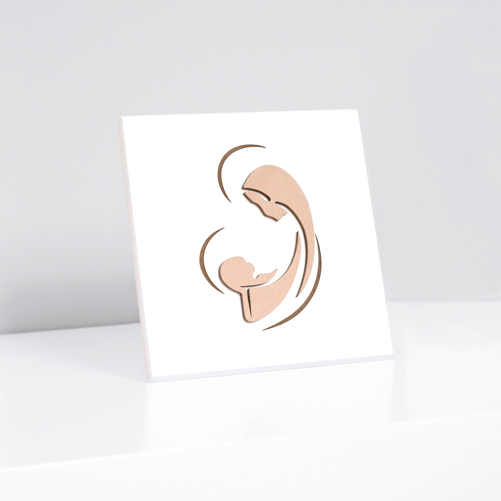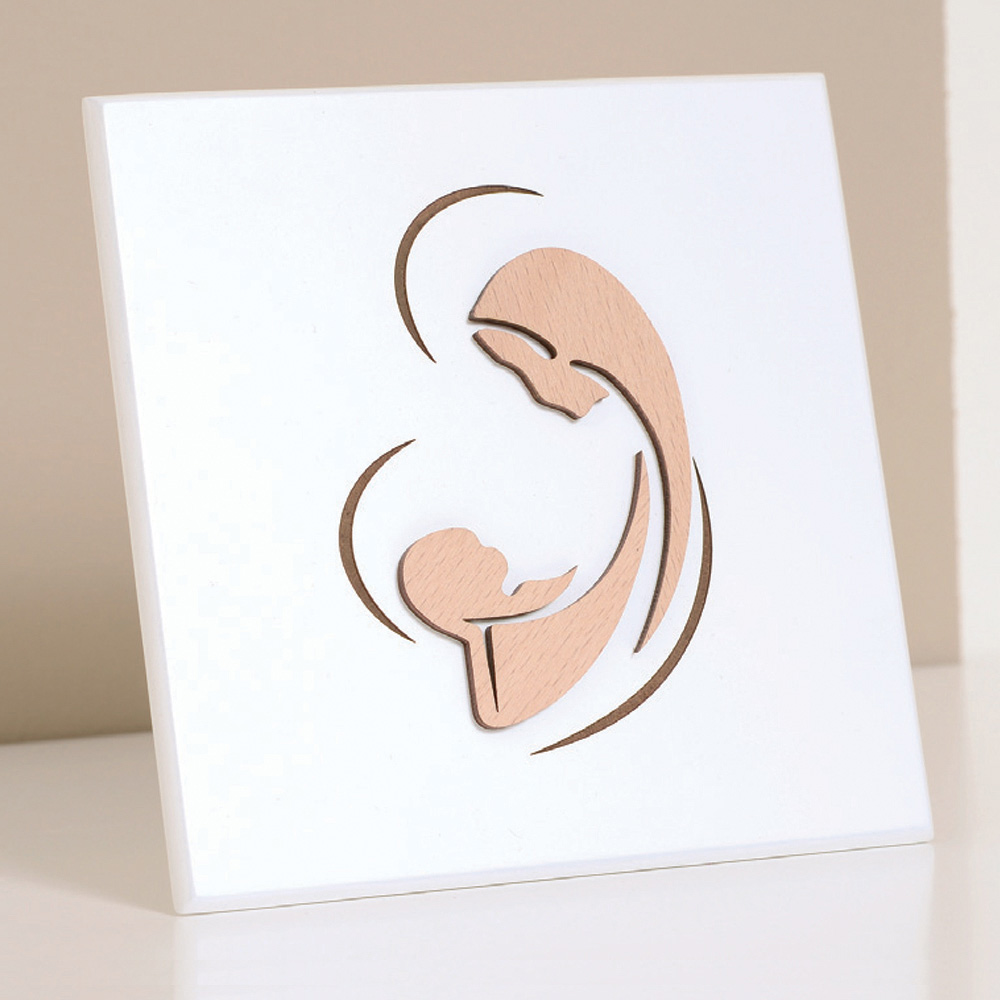 Heiligenbild mit stilisierter Mutter und Kind , appliziert in Naturholz. Weiß lackierte Holzplatte mit Stützfuß und Loch zum Aufhängen an der Wand.