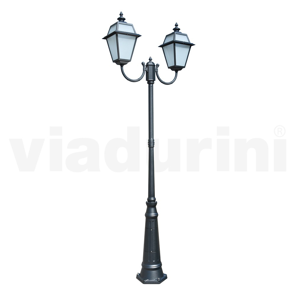 2-flammige Straßenlaterne für den Außenbereich, hergestellt in Italien mit Struktur aus Aluminiumdruckguss , anthrazitgrauem Finish und Glasdiffusor . Komplett mit Edelstahlschrauben. Elegante Merkmale und wesentliche Formen erwecken ein Einrichtungsaccessoire mit traditioneller Persönlichkeit zum Leben, das sich dank der wunderbaren Details, aus denen es besteht, durch eine raffinierte Ästhetik auszeichnet. Das Ergebnis ist eine raffinierte und vielseitige Außenlampe, die sich ideal für Außenbereiche wie Gärten, Innenhöfe, Alleen und Gehwege, aber auch für gewerbliche Räume wie Bars und Restaurants eignet.