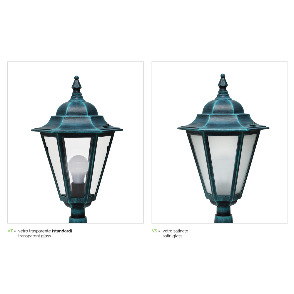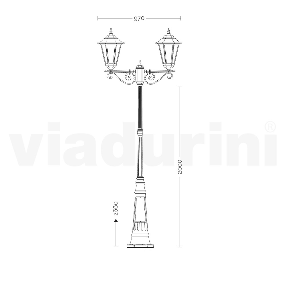 2-flammige Gartenlampe, komplett in Italien hergestellt, mit Struktur aus Aluminiumdruckguss und Glasdiffusor . Komplett mit Edelstahlschrauben. Eine elegante Ästhetik , die Vintage-Stil und Funktionalität für ein exklusives und hochwertiges Ergebnis kombiniert. Seine einfache und geradlinige Struktur wird durch wunderbare und präzise Details bereichert, die dank ihrer romantischen Persönlichkeit die Einzigartigkeit des Produkts unterstreichen. Ideal für Außenbereiche wie Gärten, Innenhöfe, Alleen und Gehwege, aber auch für gewerbliche Räume wie Bars und Restaurants.