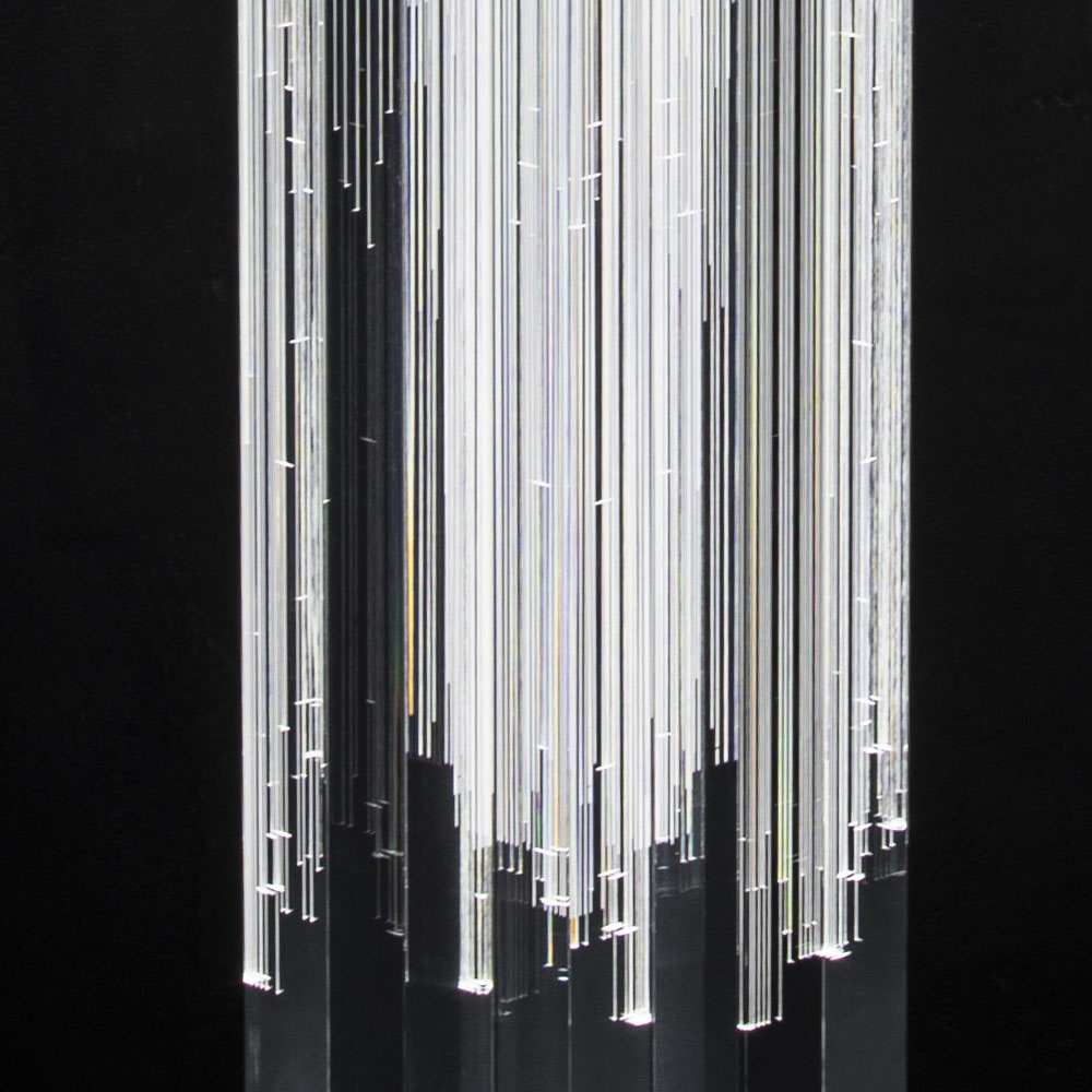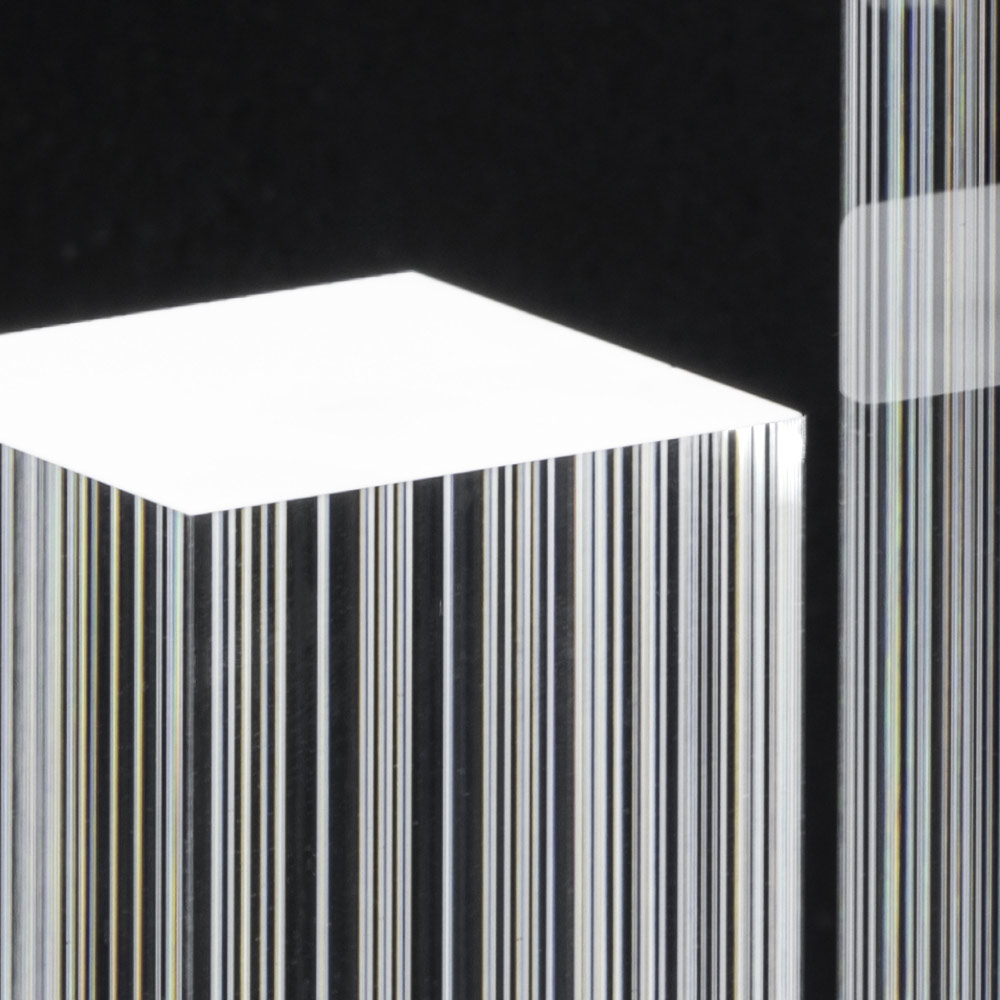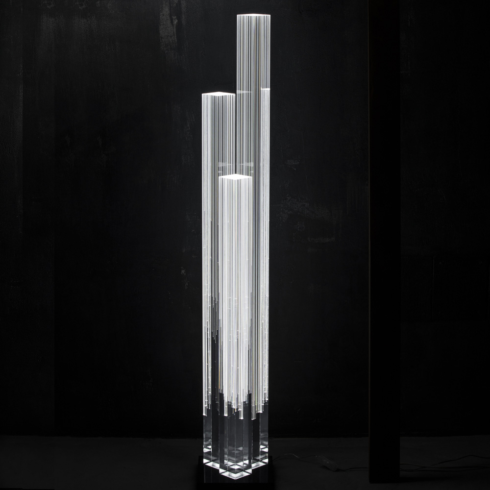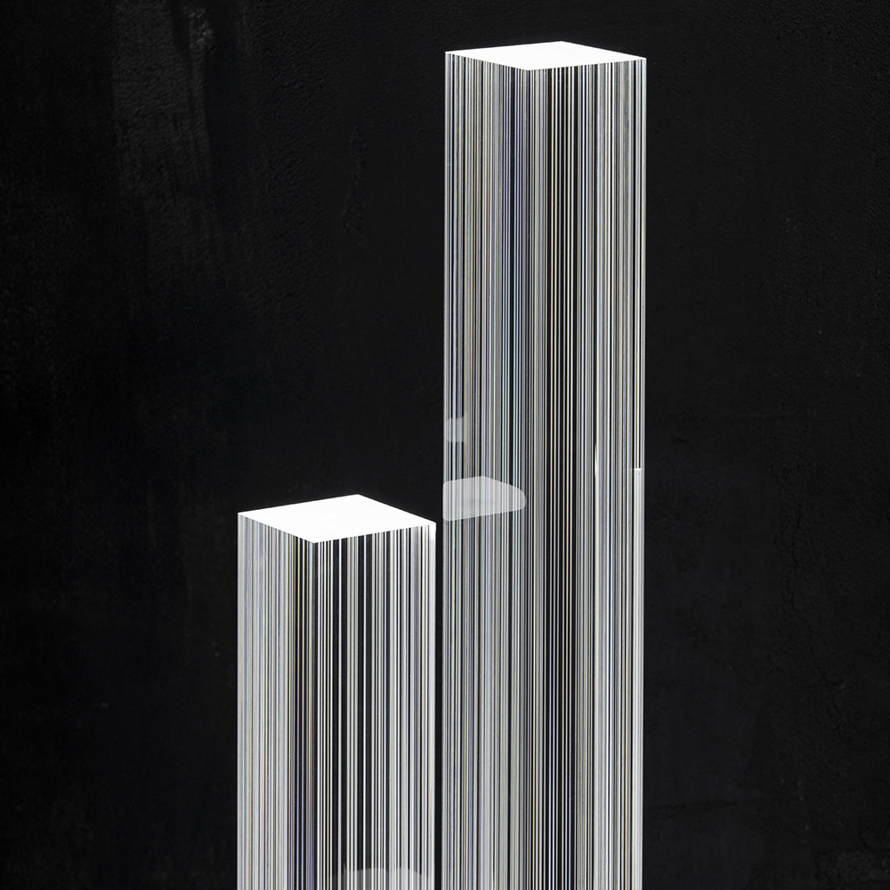 Diese Stehlampe besteht aus einzigartigen Blöcken aus Acrylkristall, die mit Lasertechnologiegeschliffen und graviert wurden , und einem Sockel mit dem LED-Leuchtkörper. Die so entstandene satinierte Oberfläche verleiht der Leuchte eine außergewöhnliche szenografische Wirkung, die sich über die gesamte Höhe erstreckt.