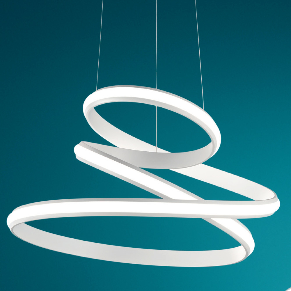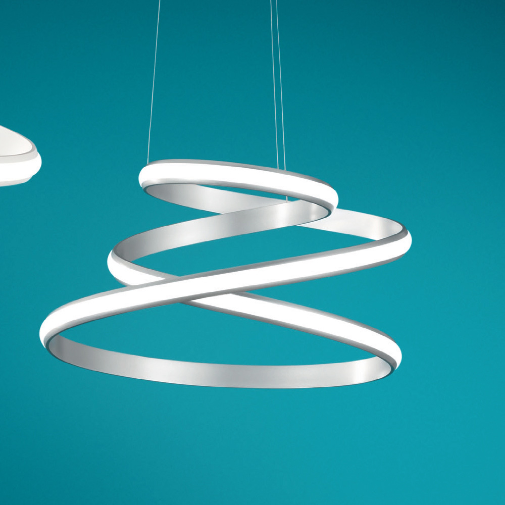 Pendelleuchte mit lackierter Metallstruktur komplett mit längenverstellbaren Kabeln und LED-Lichtquelle . Ein dynamisches und modernes Design, das in der Lage ist, das Gefühl eines sich drehenden Bandes nachzubilden und so den Wert und die Ästhetik des Produkts zu bereichern. Dieses Bewegungsgefühl wird zu seiner Stärke und ermöglicht es ihm, in Wohn- oder Objektumgebungen mit einem zeitgenössischen und avantgardistischen Stil den Mittelpunkt der Aufmerksamkeit zu erobern. Die moderne LED-Technologie sorgt zudem für eine hochwertige Beleuchtung, die die Leuchte vervollständigt und sie zu einer optimalen Ergänzung für alle macht, die Funktionalität und Design in einem einzigen Produkt suchen.