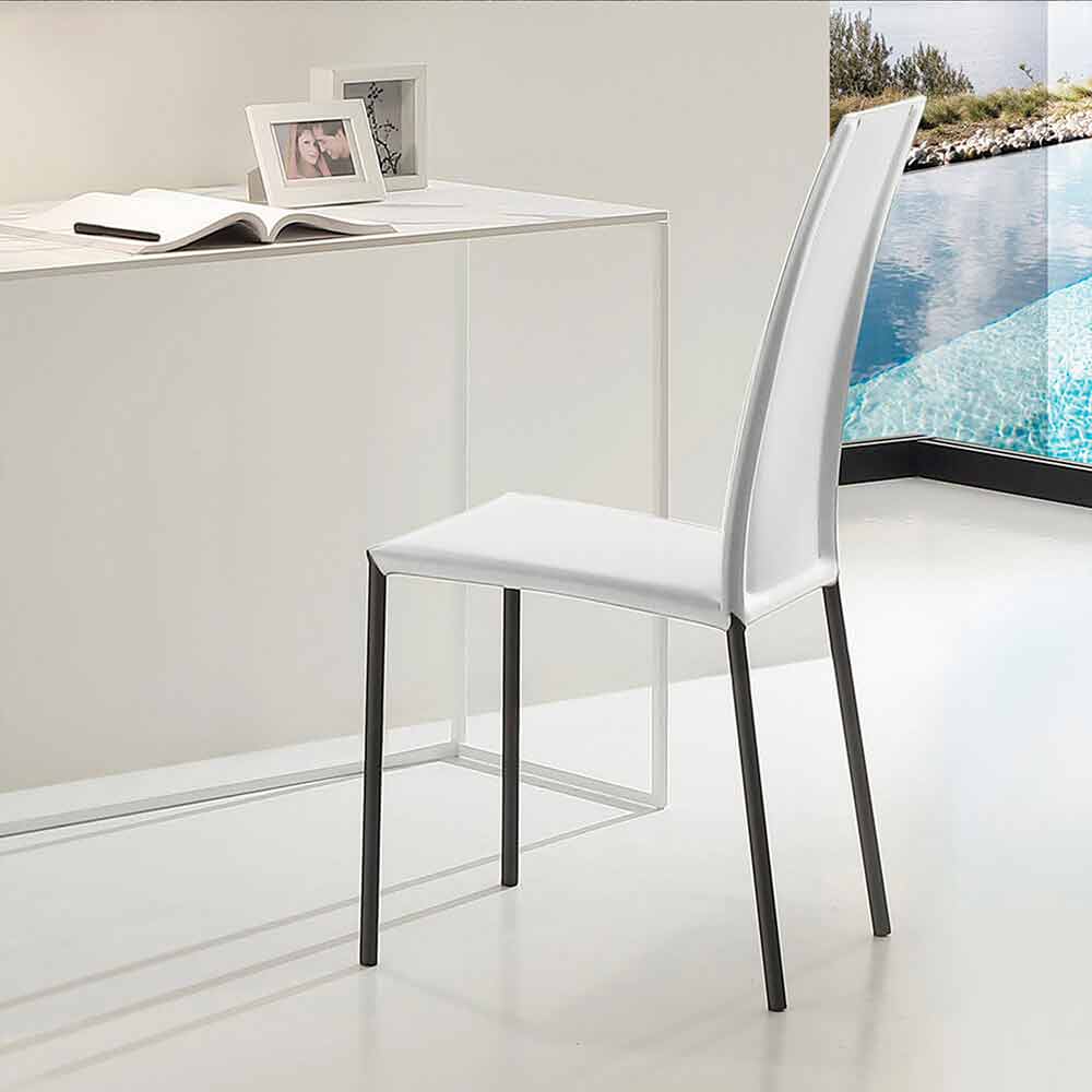 Eine Ergänzung mit einem einfachen und essentiellen Design , das durch die wunderbare Kombination zwischen dem Hauch von Klasse des Belags und der unbestrittenen Modernität des lackierten Metalls bereichert und vervollständigt wird. Die hohe Rückenlehne verleiht dem Stuhl eine längliche Form und bereichert ihn mit einer fast königlichen Ästhetik, auch dank eines Hauches von Eleganz und Raffinesse , der durch die wunderbare Textur des Leders, eines kostbaren und hochwertigen Materials, verliehen wird. Die zahlreichen verfügbaren Farben und die Wesentlichkeit seiner Formen machen es auch zu einer besonders vielseitigen Einrichtungslösung, die eine perfekte Harmonie mit den umgebenden Elementen schafft und so die Umwelt charakterisiert.