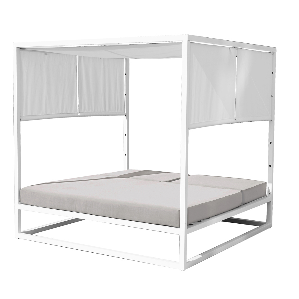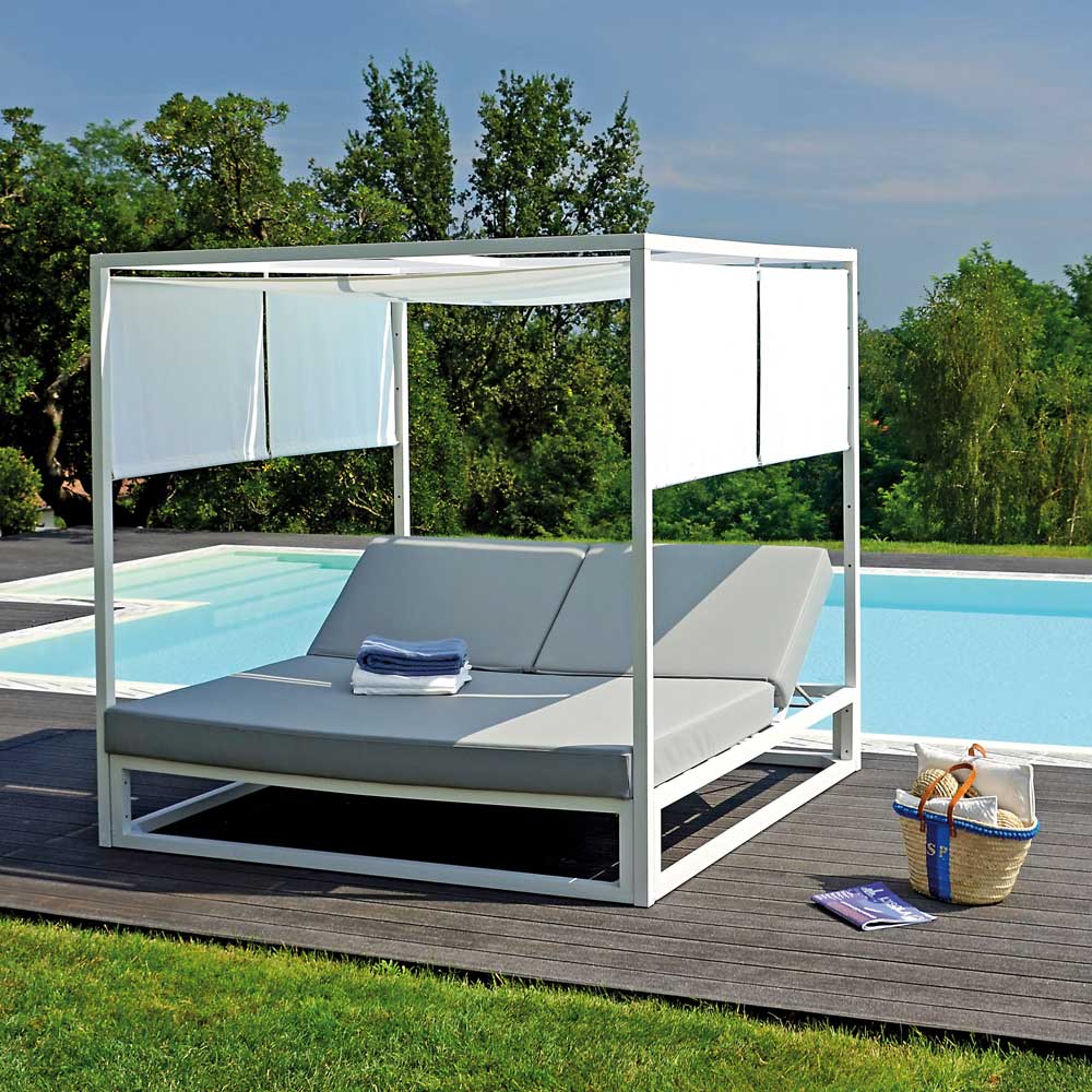 Tagesbett für den Außenbereich mit weißer Aluminiumstruktur und doppelt verstellbarer Rückenlehne.