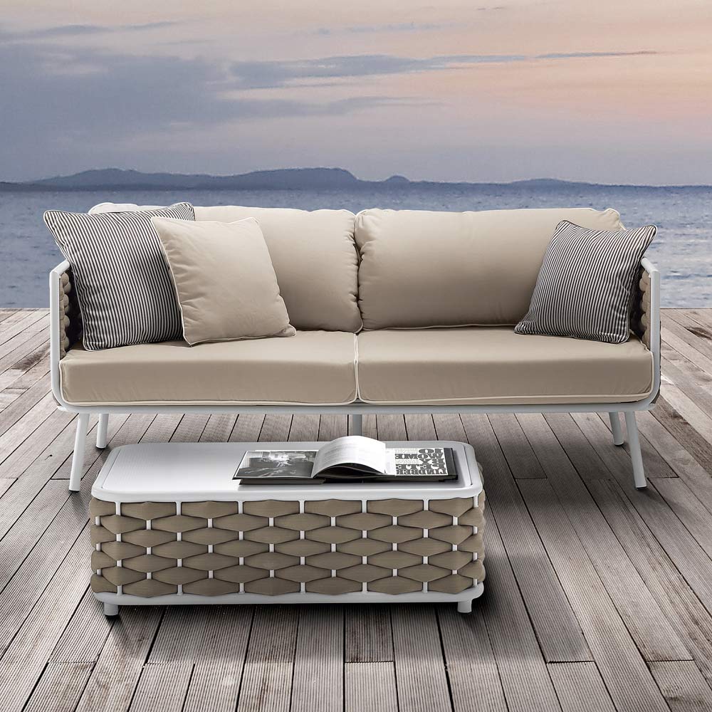 Dank der Verwendung spezieller hochwertiger Materialien garantiert dieses Outdoor-Sofa eine hervorragende Beständigkeit gegen Witterungseinflüsse, Schmutz, Staub und Flecken.