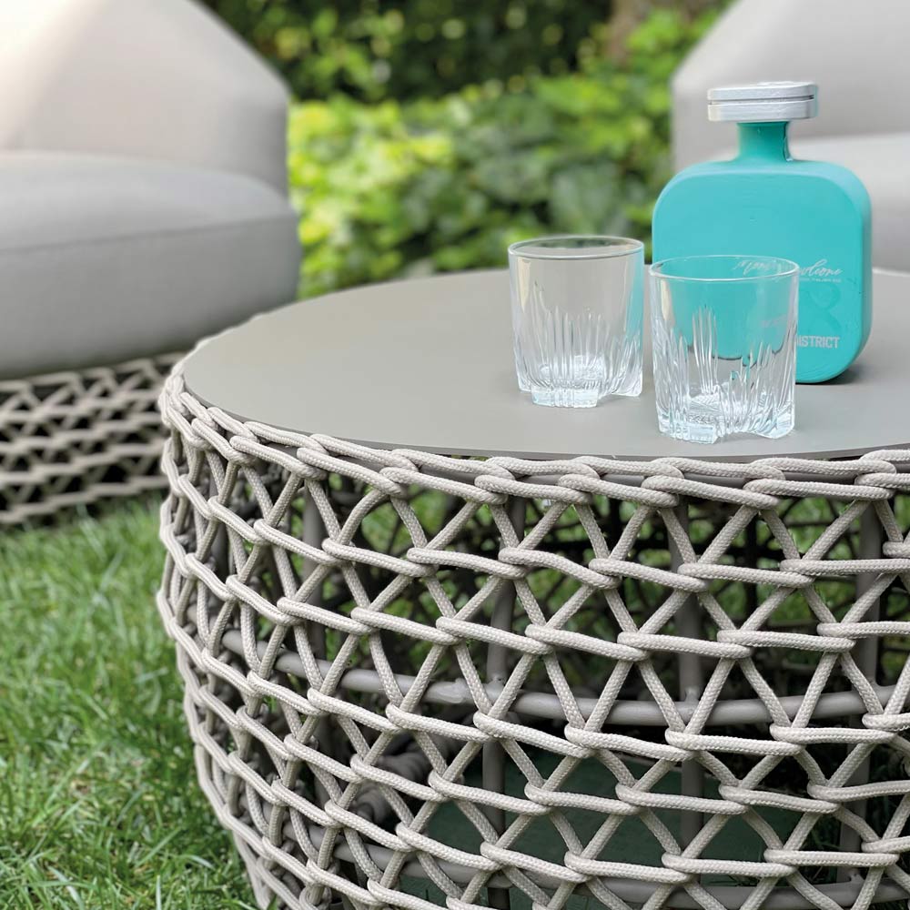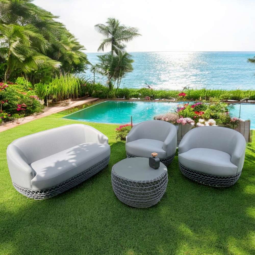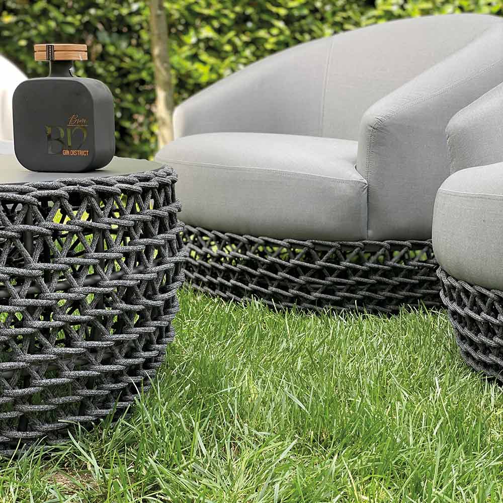 Komplettiert durch einen passenden Couchtisch mit dem gleichen dekorativen Geflecht ist dieses Lounge-Set die ideale Wahl für die Schaffung einer eleganten Oase der Entspannung , perfekt für Gärten, Terrassen und Veranden.